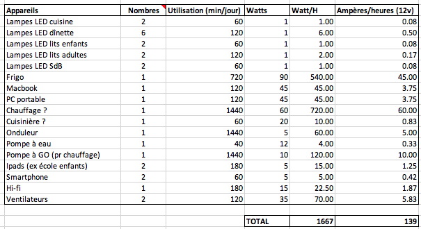 Ci-dessous, les besoins électriques de la petite famille (4 personnes) :