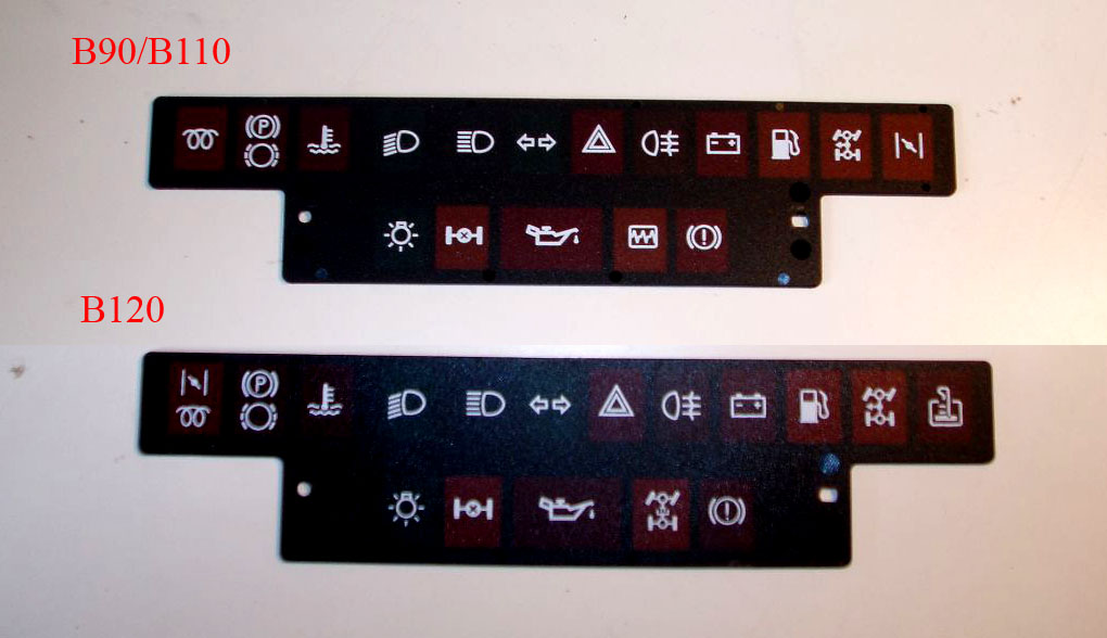 Je suis allé acheter en casse un tableau de bord de B120, je ne voulais que le compte-tours mais le gars ne détaillait pas donc me voilà avec le bloc complet : Les voyants ne sont pas tout à fait les mêmes : Le starter est parti rejoindre le préchauffage et laisse la place à... niveau d'huile (?), et le voyant qui ressemble à un oscilloscope laisse la place un voyant de crabotage du pont avant. Etonnant d'ailleurs de trouver ce voyant ainsi que celui du blocage de différentiel en série sur des véhicules qui ne sont pas 4x4 pour la grande majorité.