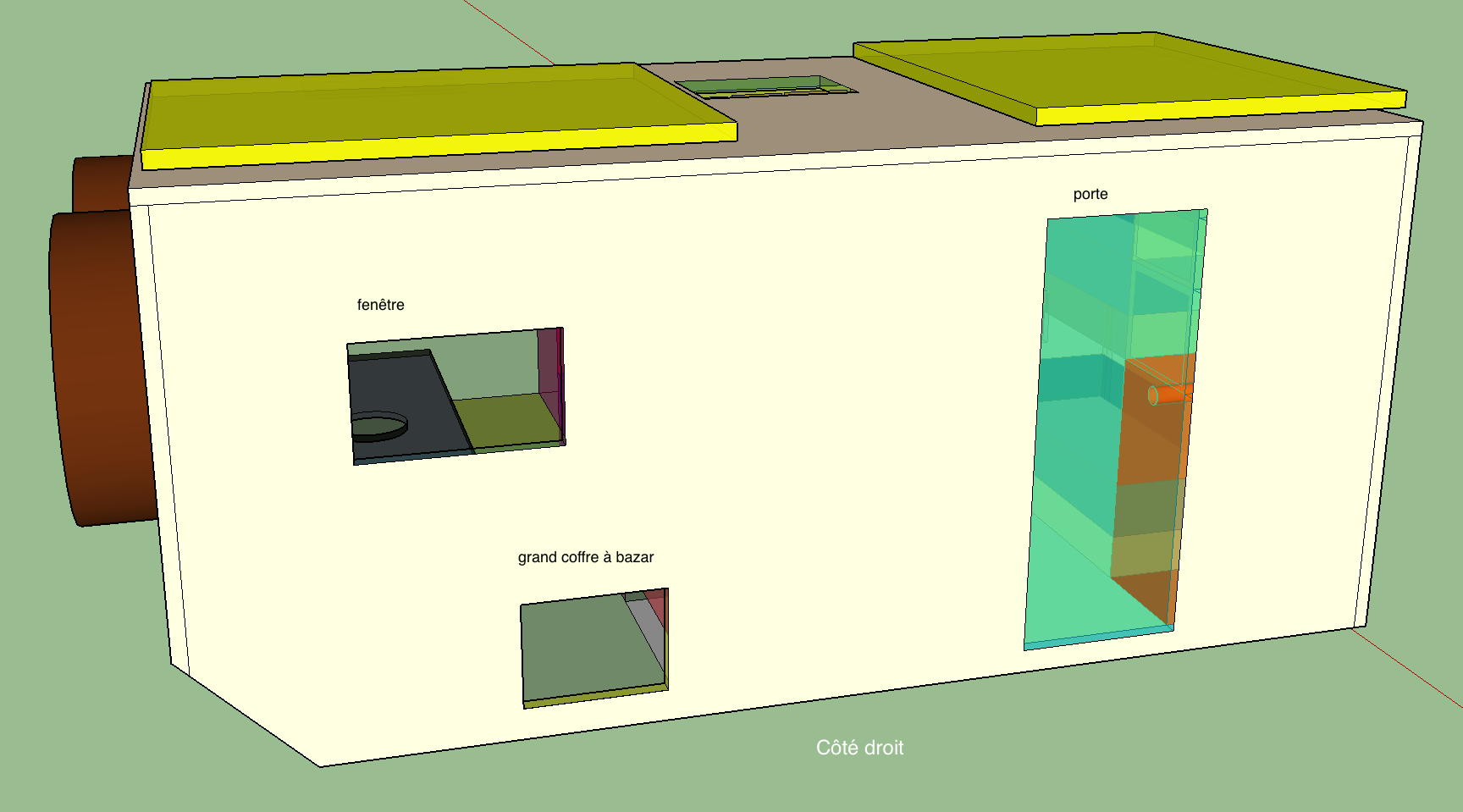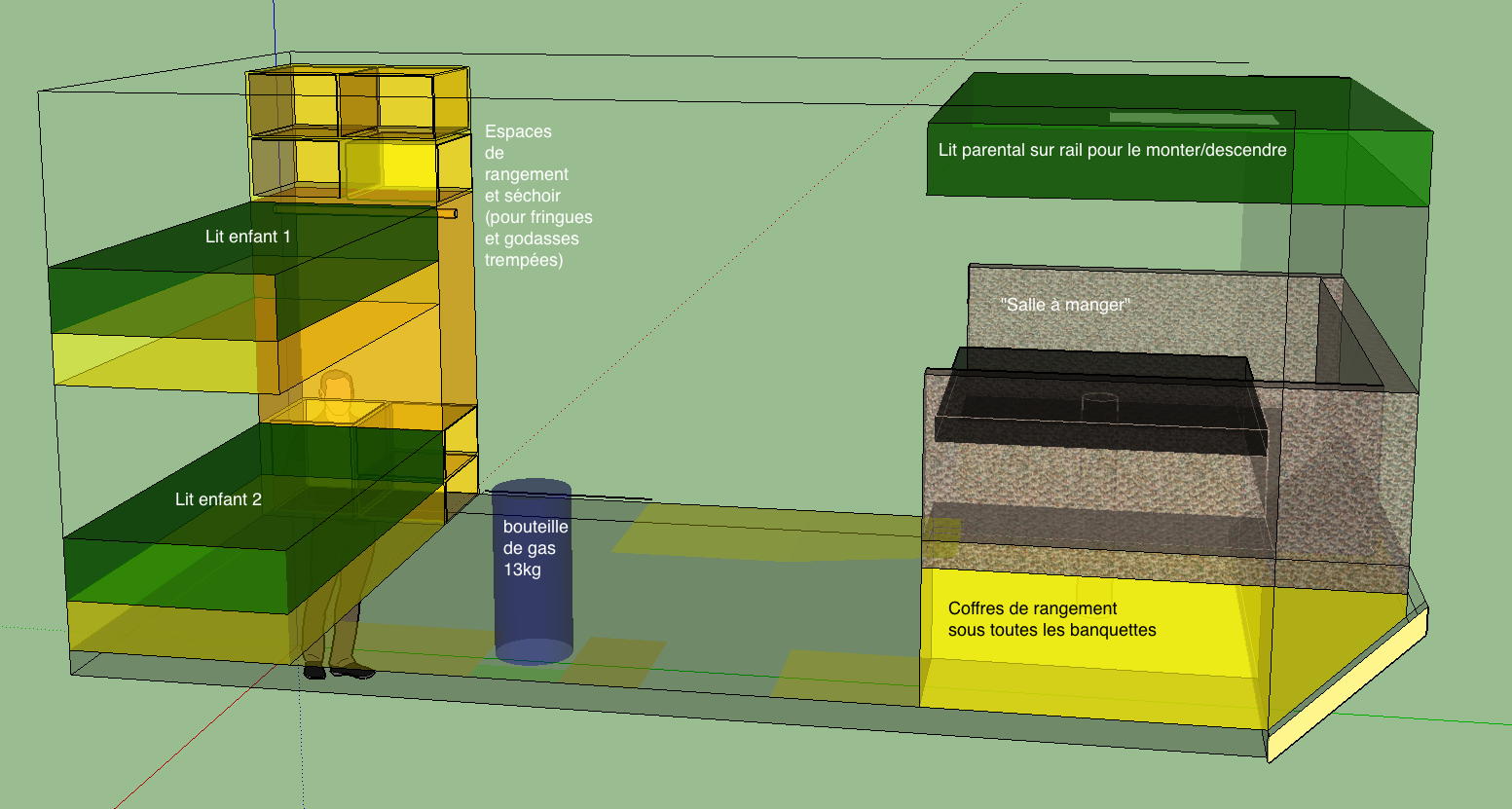 Sur une remarque de Jeff (merci !) je dois rajouter / trouver un endroit pour un coffre/espace plus grand pour table de camping et autres,...