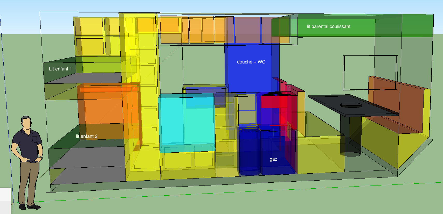 Bref, voici notre idée d'aménagement actuelle pour une cellule de 5m de long pour 2,2m de hauteur.