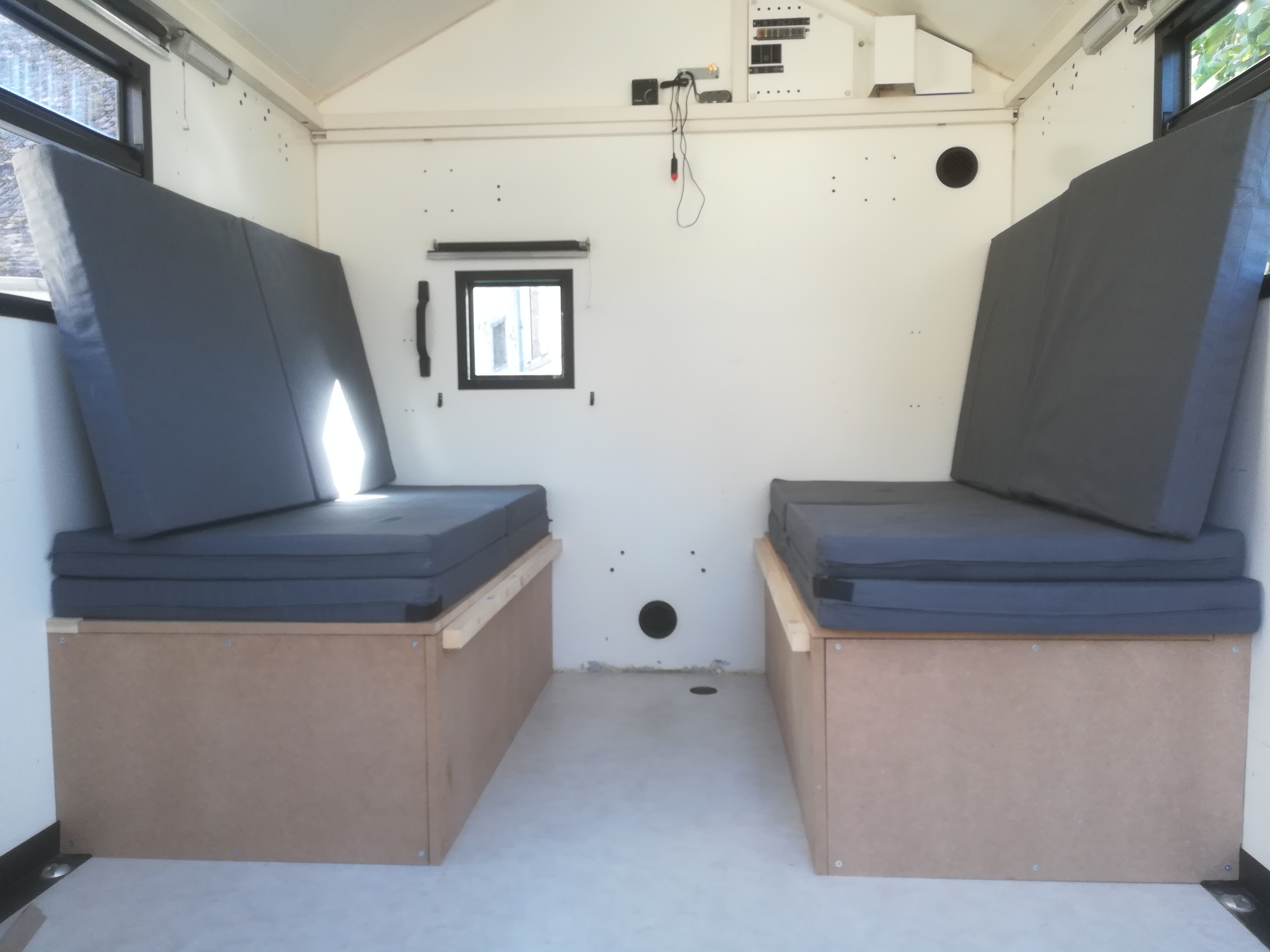 Maintenant fabrication des coffres banquettes et coutures des coussins remis à la taille voulu ,fabrication table haute ou basse suivant lit ou table puis la cuisine récupérer sur le bon coin dans une caravane