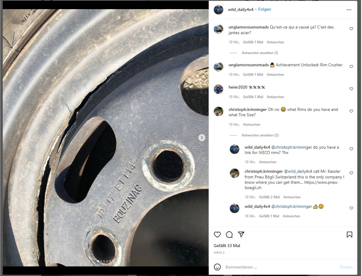 @unglamorousnomads oui des jantes acier monobloc. Mais l’ancien proprio les avait modifiées en déplaçant et en ressoudant le voile pour améliorer le déport. Toutes les photos sont de la même jante. Une seule a cassé peut-être à cause d’une faiblesse. Mais par prudence j’ai mis les autres à la destruction.