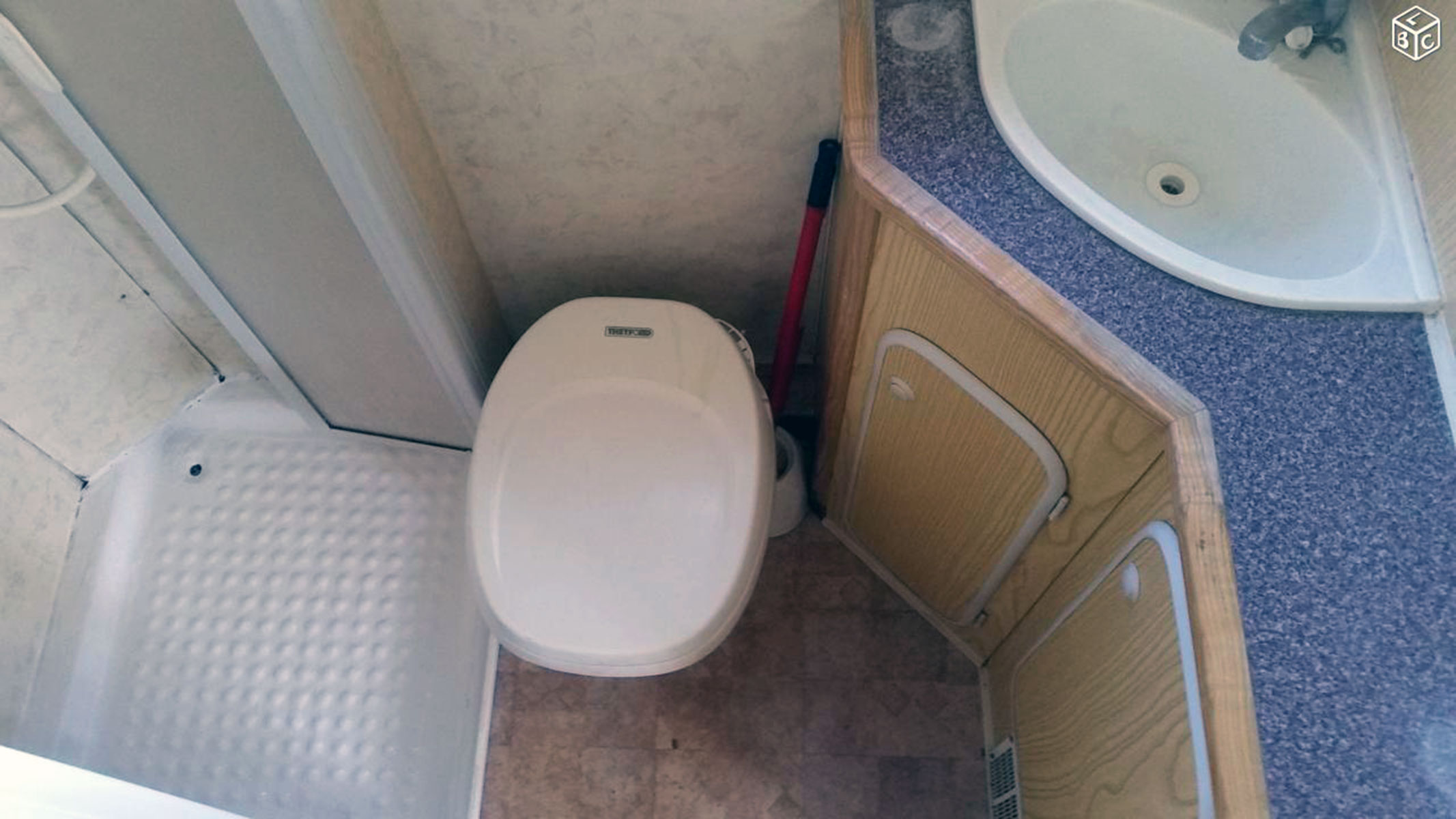 Enfin, côté intérieur, il est bien sûr à rafraîchir après 20 ans de bons services. Les joints dans la douche par exemple sont à refaire. A nouveau, absolument rien de rédhibitoire! J'avais prévu de mon côté si je l'achetais de refaire tout l'intérieur. Je n'aurais gardé que le lit pavillon ;) De la même façon, la CG prévoit 5 personnes, mais en 98, on ne connaissait pas les ceintures 3 points. Et vu que je serais parti avec 1 ou 2 enfants en bas âge avec sièges auto, j'aurais fait installé une banquette moderne.