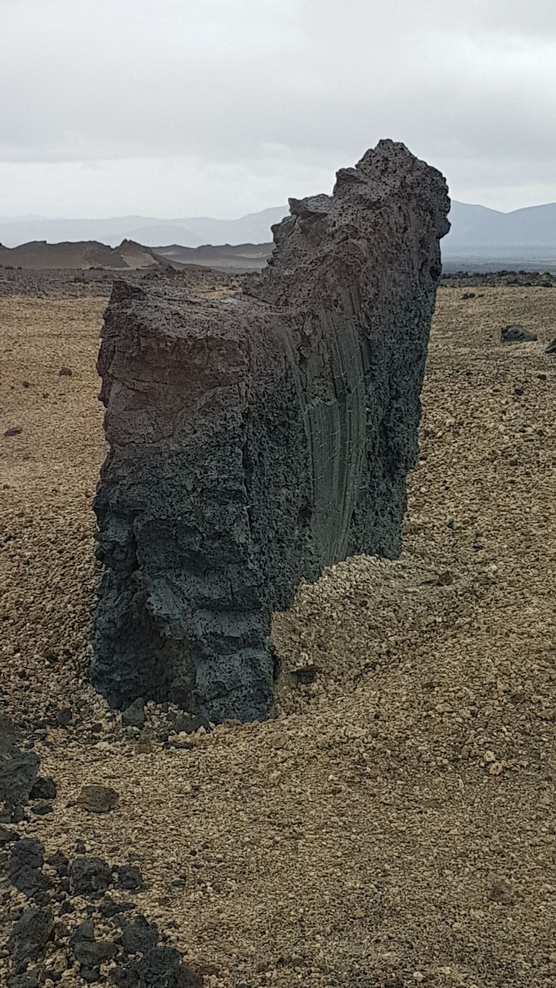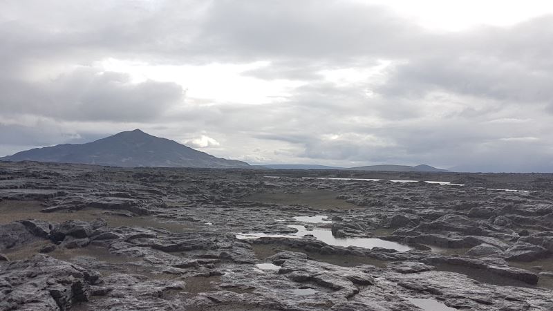 C’est la zone des pierres ponces rhyolitiques. Au début, on est surpris par ces petit caillou qui peuvent flotter sur l’eau. On en trouve partout dans la zone d’Askja, mais au sur le chemin pour aller au Viti, on en trouve des beaucoup plus grande. Le but était de trouver la plus grande pierre ponce avec les enfants, c’est le plus petit qui a gagné avec un beau spécimen de plusieurs dizaines de centimètres. Seul problème, le temps d’arriver au niveau des deux lacs, le temps c’est un peu dégradé. Les passages nuageux ont laissé la place à un temps plus humide. La terre aux abords du lac devient très glissante.