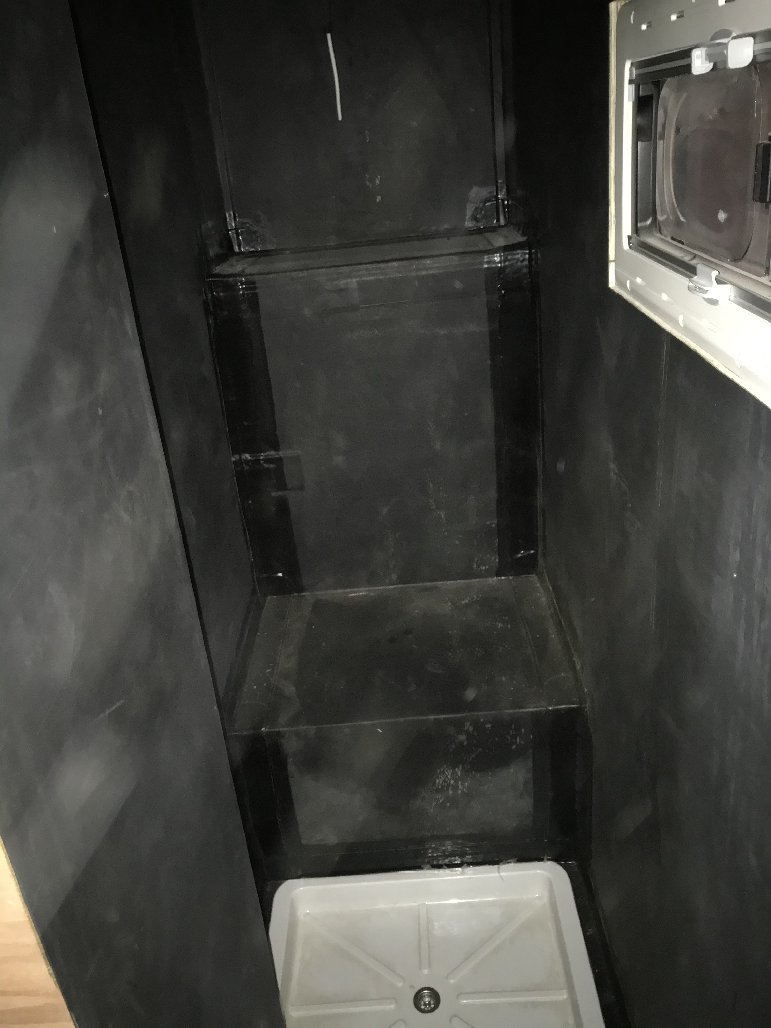 la meilleur solution est de créer un moule de salle de bain faire la pièce dans le moule et la poser dans la cellule. (dans les bateaux de plaisance c’est fait comme ça)
