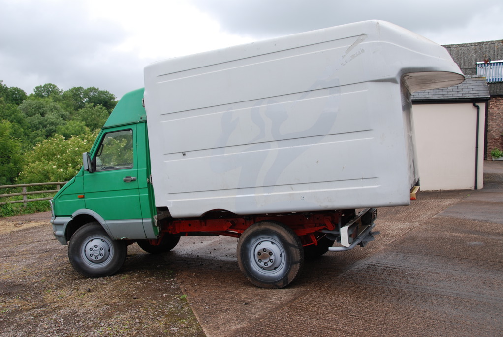 J'ai gardé ce container alu car il correspondait de très près à mes besoins. Autrement j'aurais racheté une caisse isotherme afin de la bricoler ( là, toujours pas de "carrossier professionnel" ). Tant qu'il n'y a pas de gros bricolages style ouverture totale d'un passage cabine-cellule ou rallongement de châssis, je ne vois pas l'obligation d'un pro. Y compris pour un faux châssis 3 points qui n'est qu'un assemblage mécano-soudé boulonné sur le châssis...