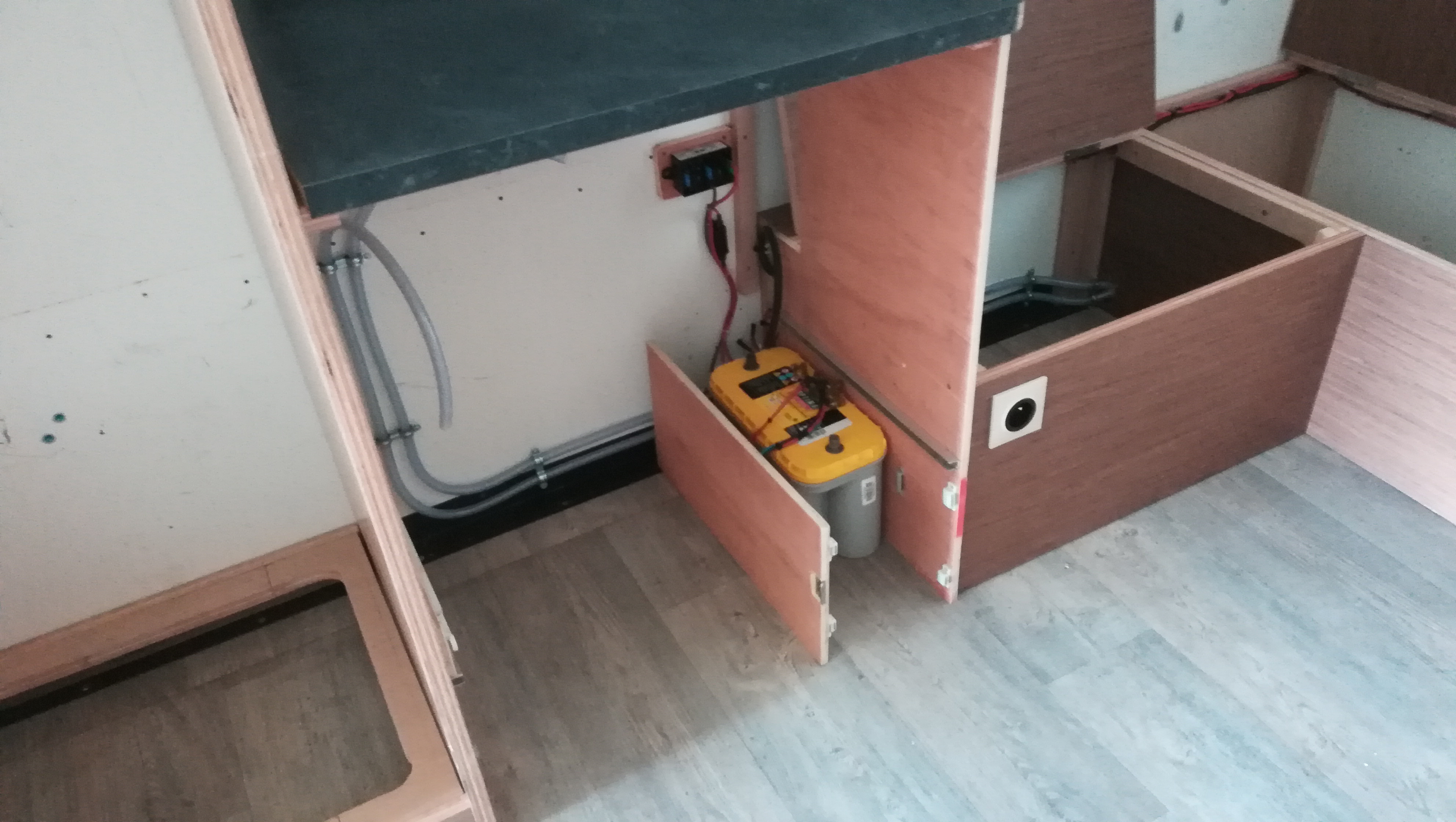 un plan de travail avec rangement et frigo dometic à compression 50l + la batterie et le coupleur séparateur en dessous