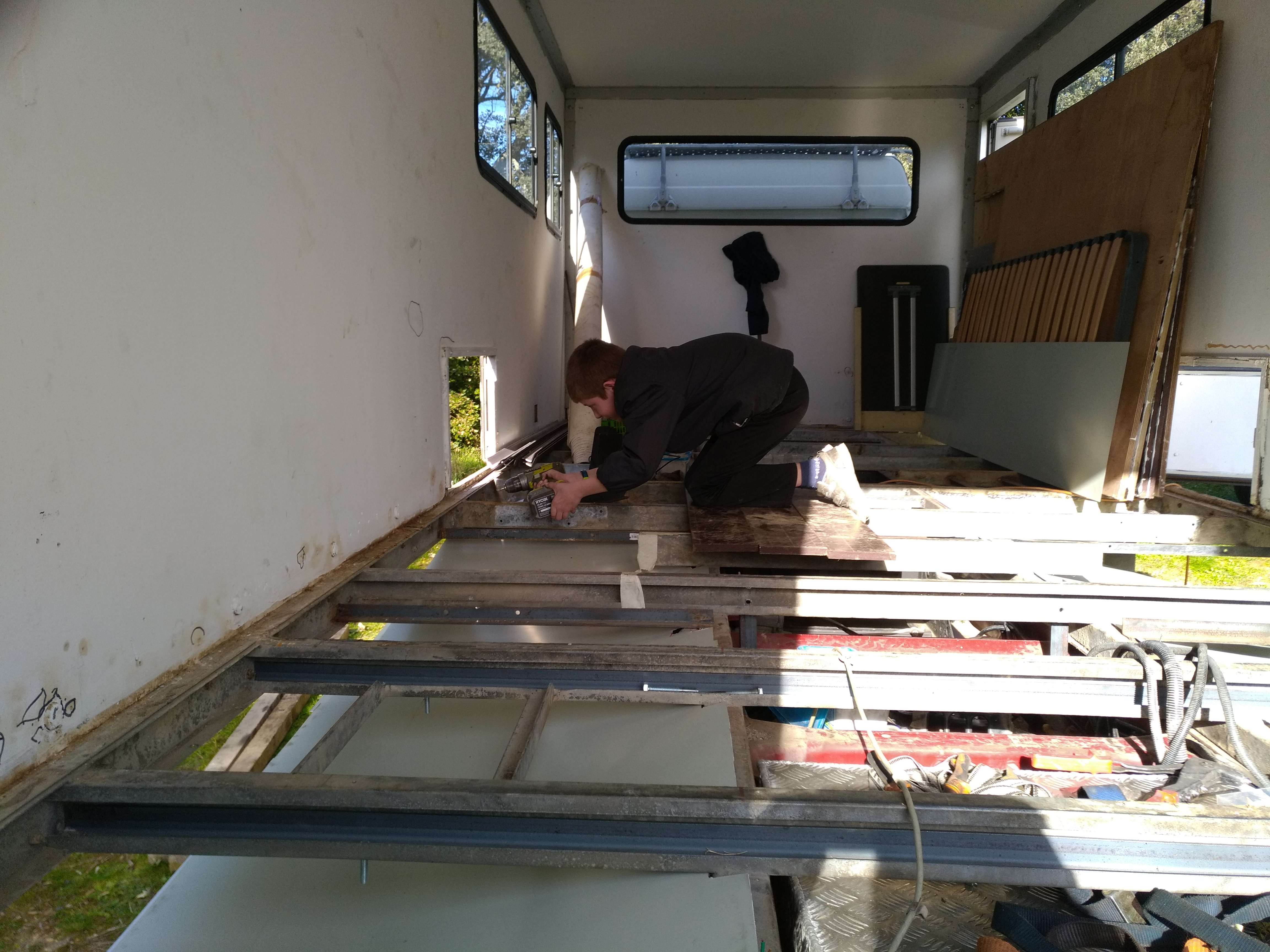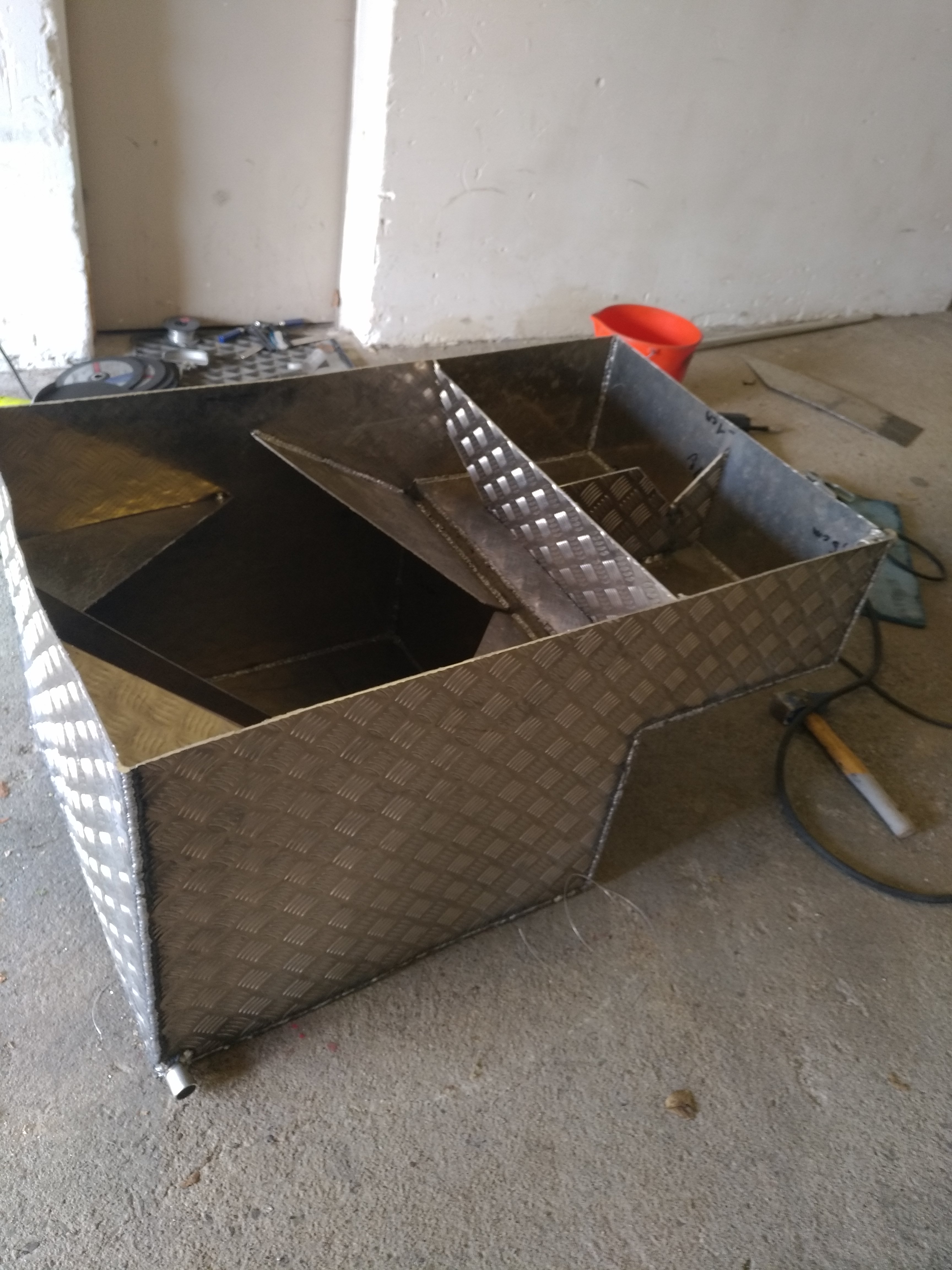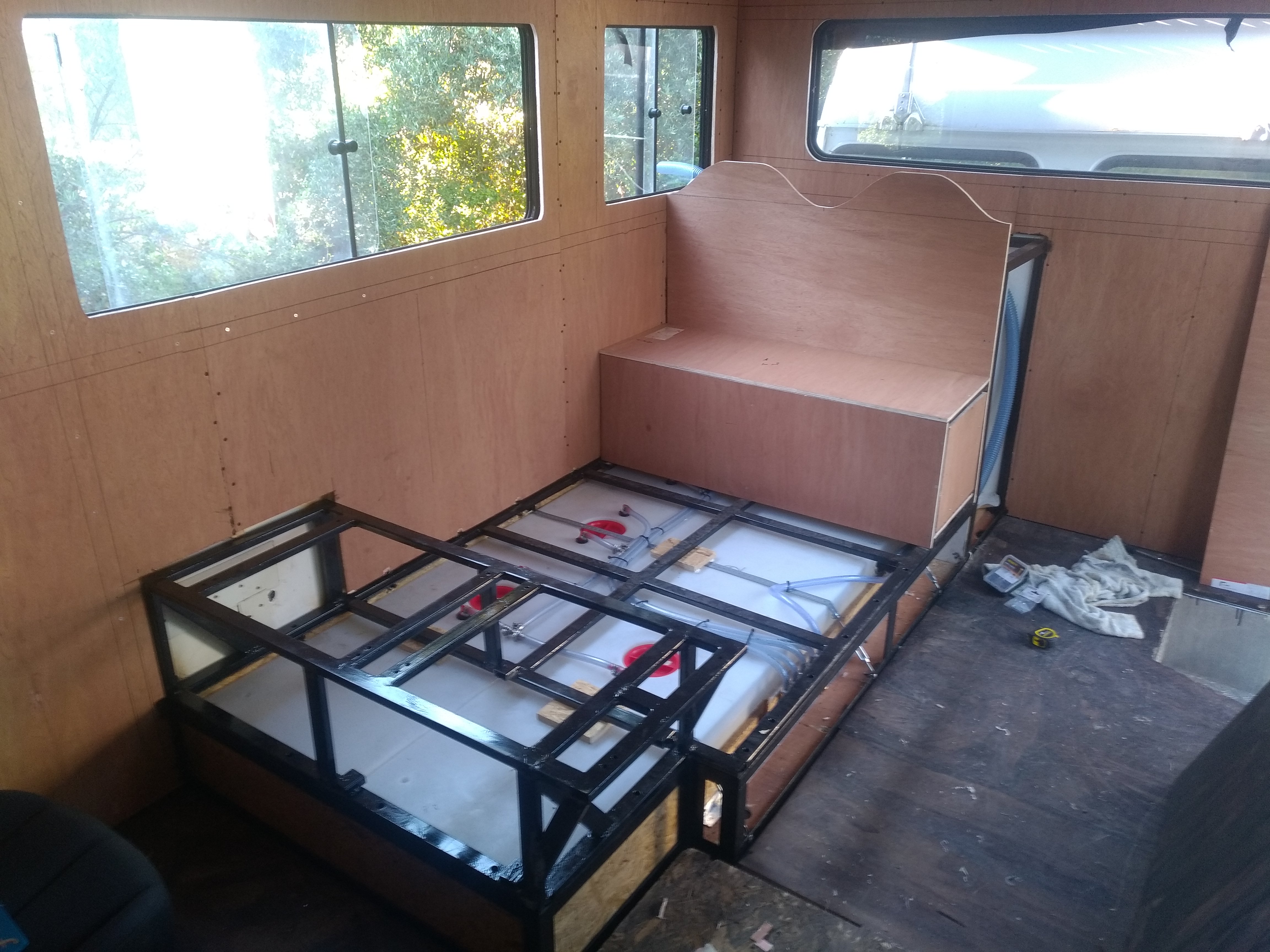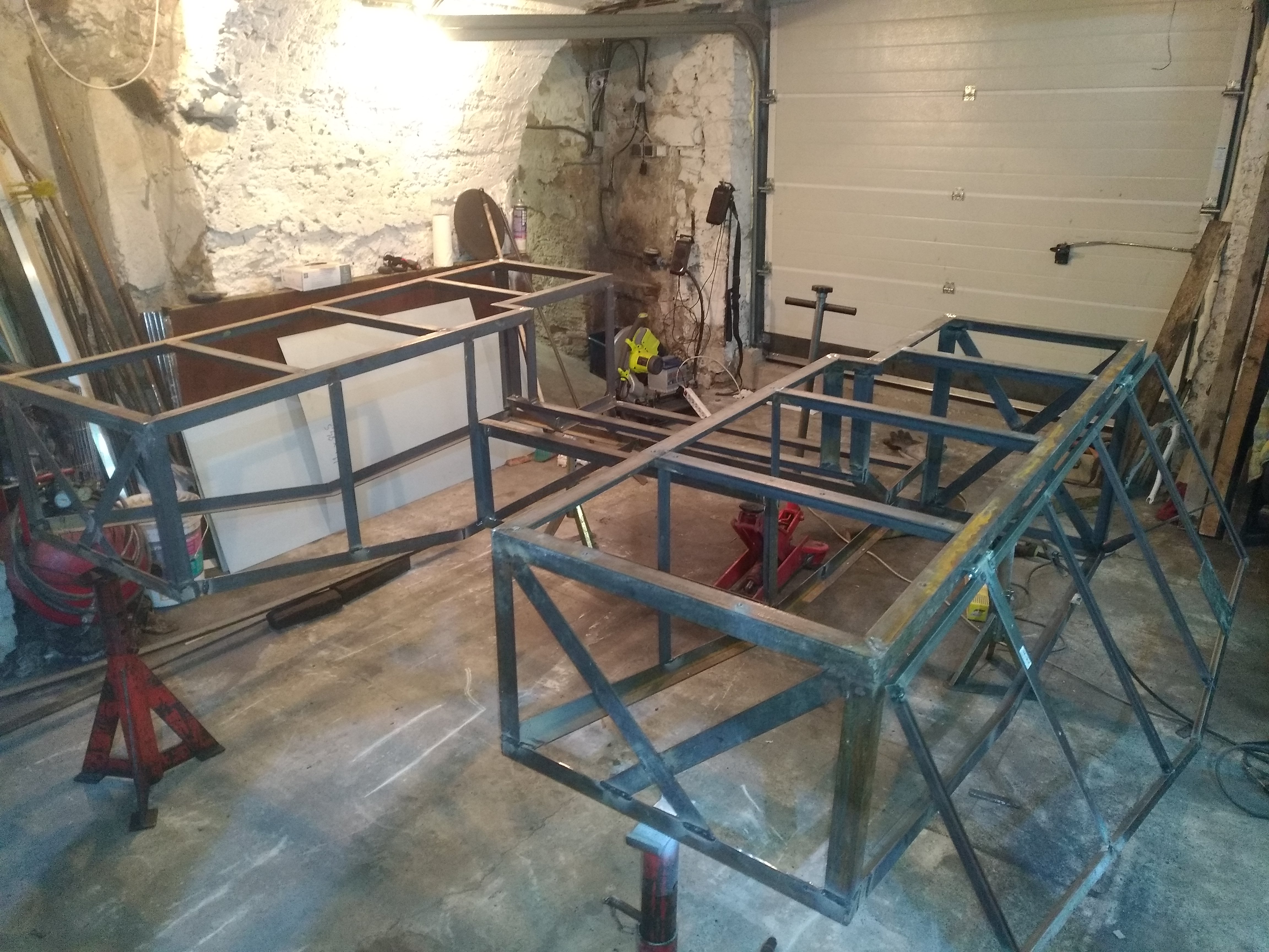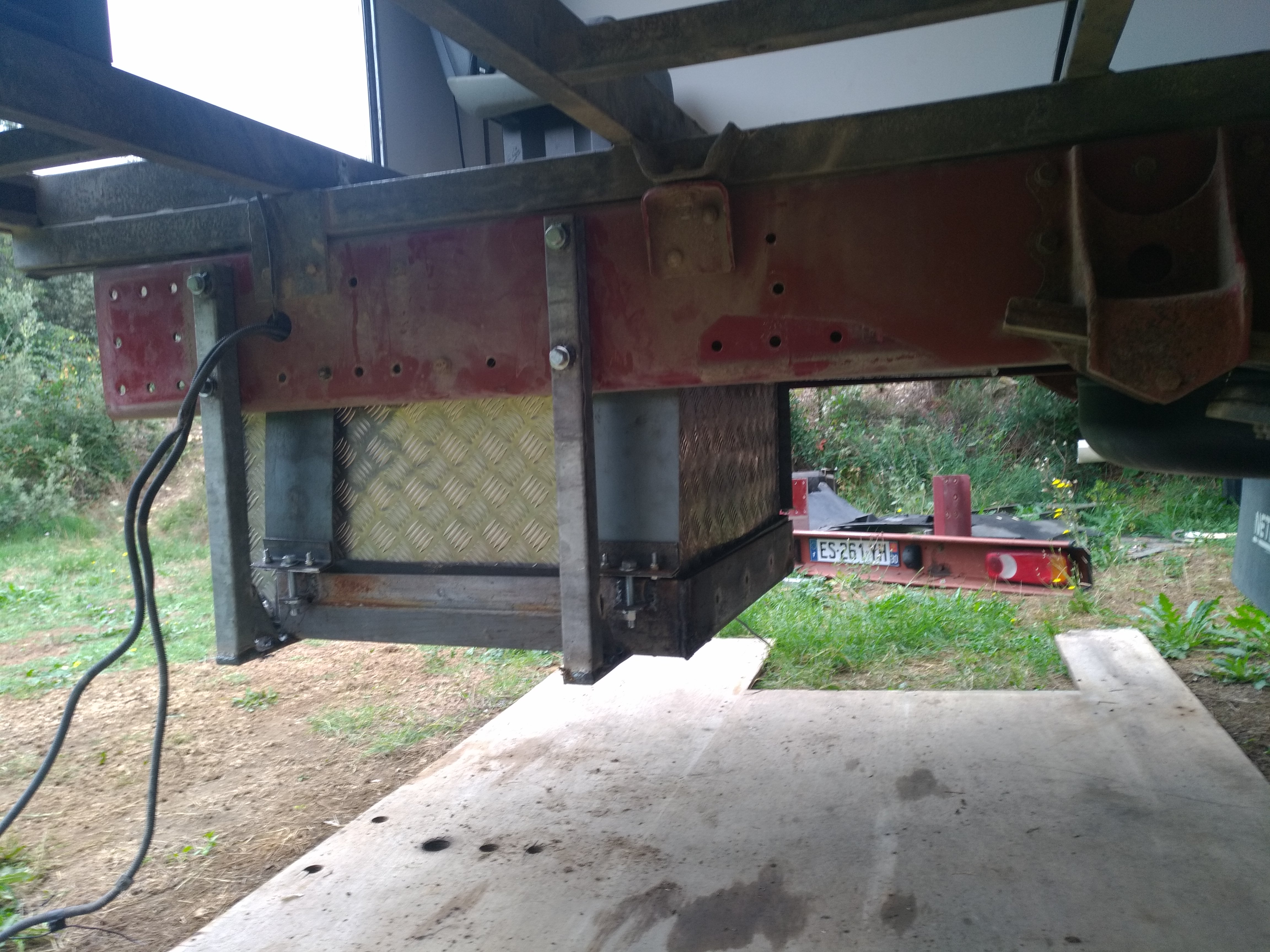 j ai retiré les coffres , gardes boue , bac à batteries afin de fabriquer des coffres plus volumineux ainsi que les réserves d'eau , dans l'ideal j'aimerai utiliser l'espace entre les longerons afin de faire des coffres accessibles de l'interrieur , pour l'instant je ne termine pas les soudures du cadre qui reçoit les sièges tant que je n'ai pas eu l'aval du drealman à qui j'ai envoyé les photos ...