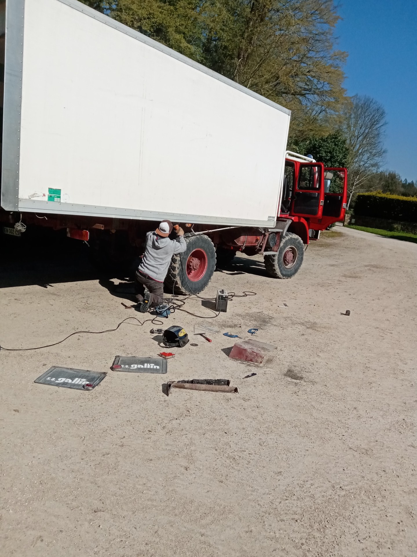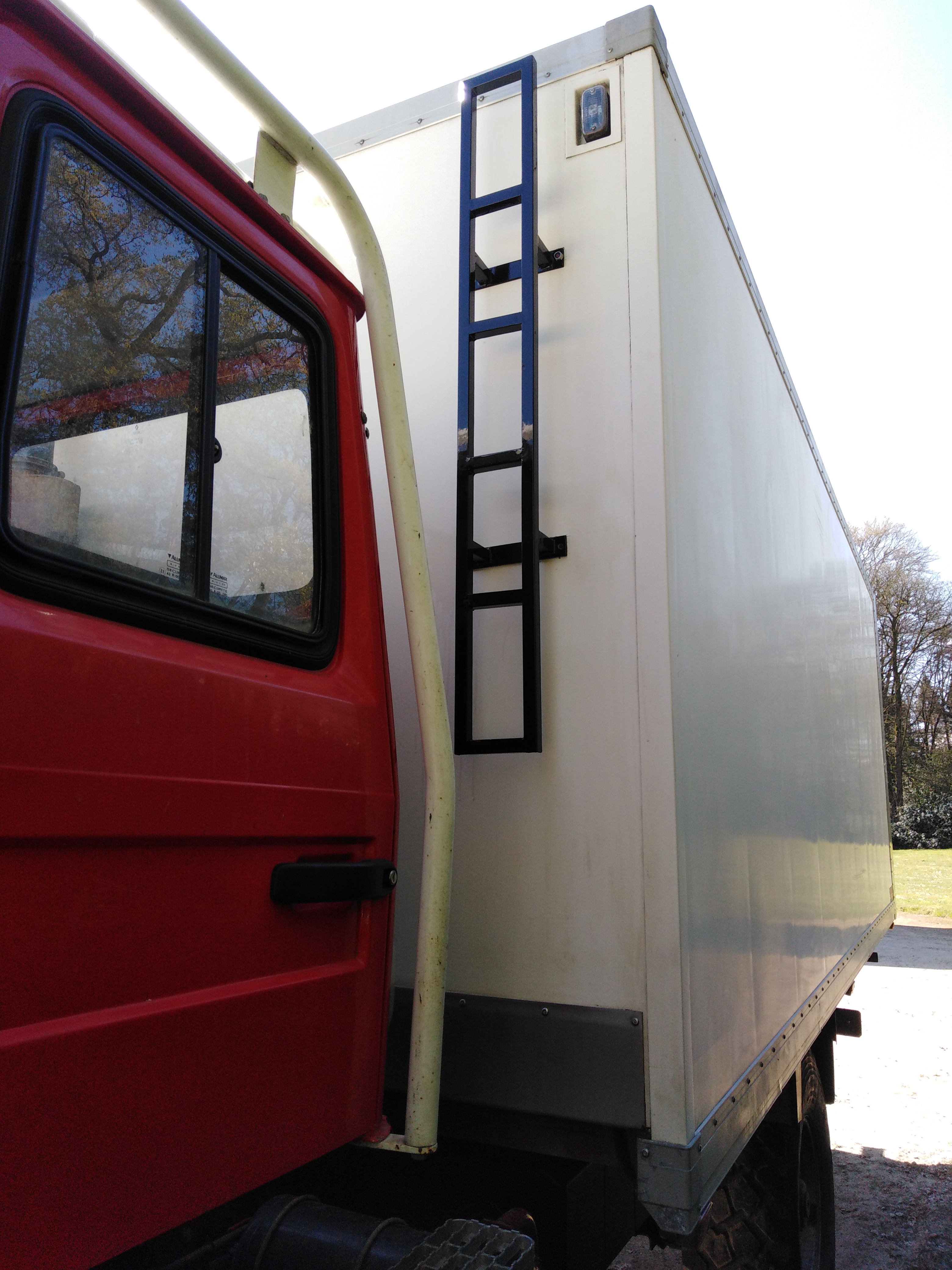 Travaux de la semaine, fabrication et pose d'une échelle pour accéder au toit puis pose des garde de boue arrière et feux longues portée. Bonne journée à toutes et à tous