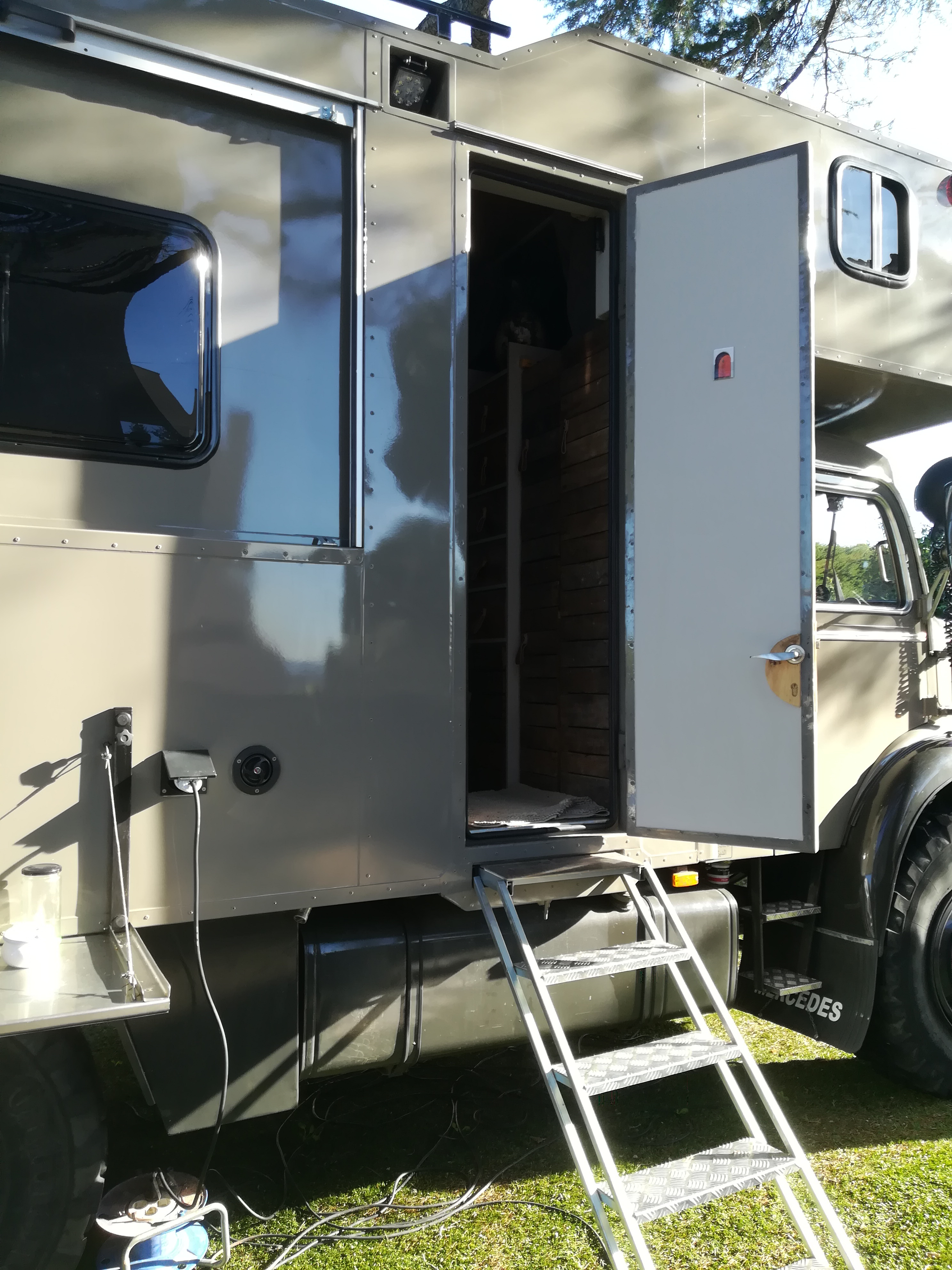 bonjour antonio, j'ai tout fait mais je me suis fait aider pour toute la partie structure metal (faux châssis et structure de la cellule) avec un atelier qui fait des bonnes vrai soudures, on a refait aussi toute les parties rouillées et ils y en avaient partout, tout autour du pare brise, les bas de portes, etc.......donc il a était refait a fond, châssis sablé et repeint, pose de suspension pneumatique...on l'a fait sur mesure en fabricant chaque pièce, etc.....on a refait tout l'électricité de a a z en enlevant tout. on a fait tous les réservoirs inox sur mesure pour augmenter les capacité, maintenant j'ai 500l eau et 500 carburant ...et bientôt 250 l de plus pour une station de filtration d'huile usagé car il vas rouler a l'huile et je monte une station autonome de filtration avec centrifugeuse a l'arrière du camion...quand on fait un tour du monde, le coût le plus important avec nos engins c'est le diesel..donc voila pourquoi le passage en bi carburation.