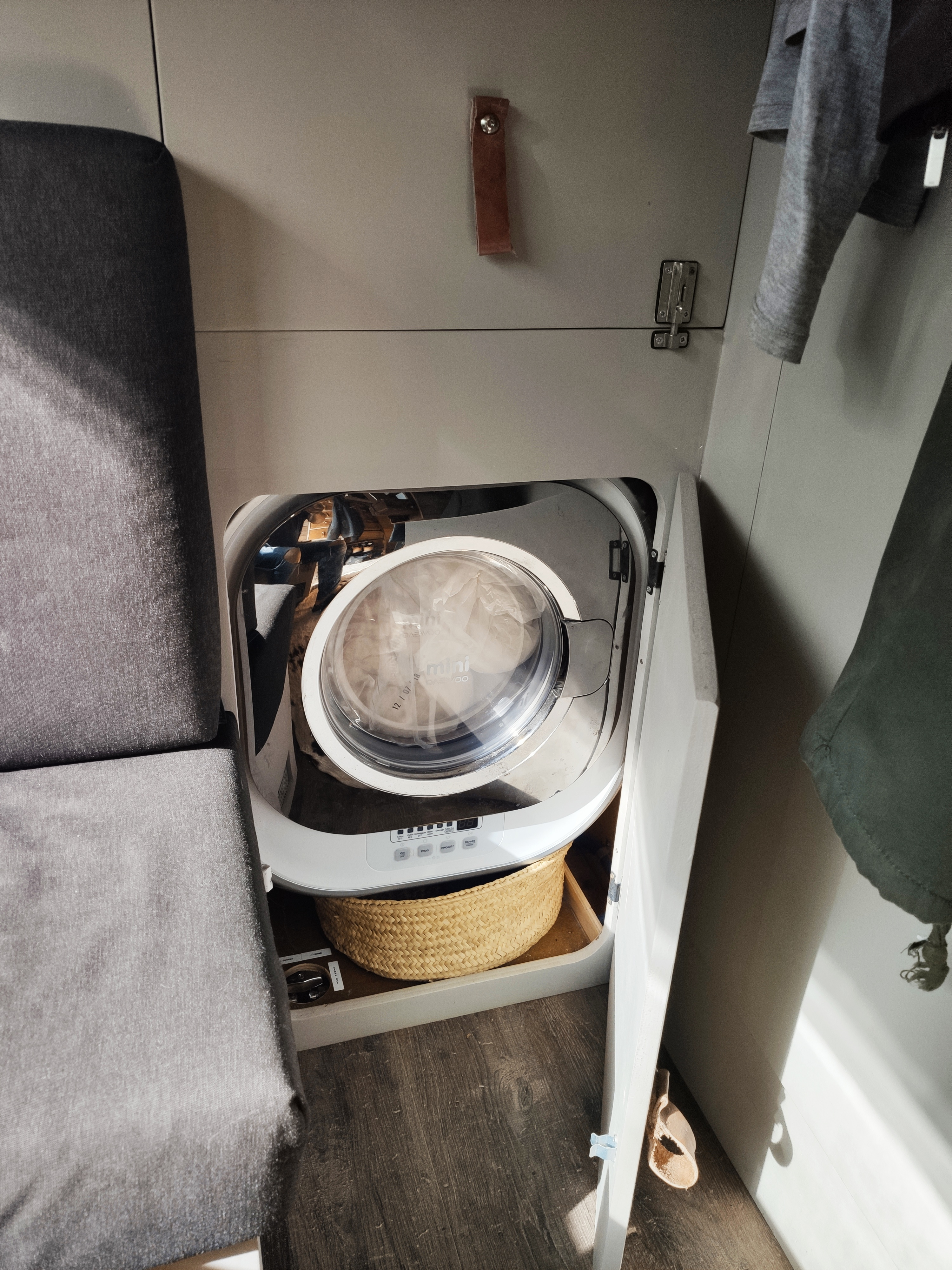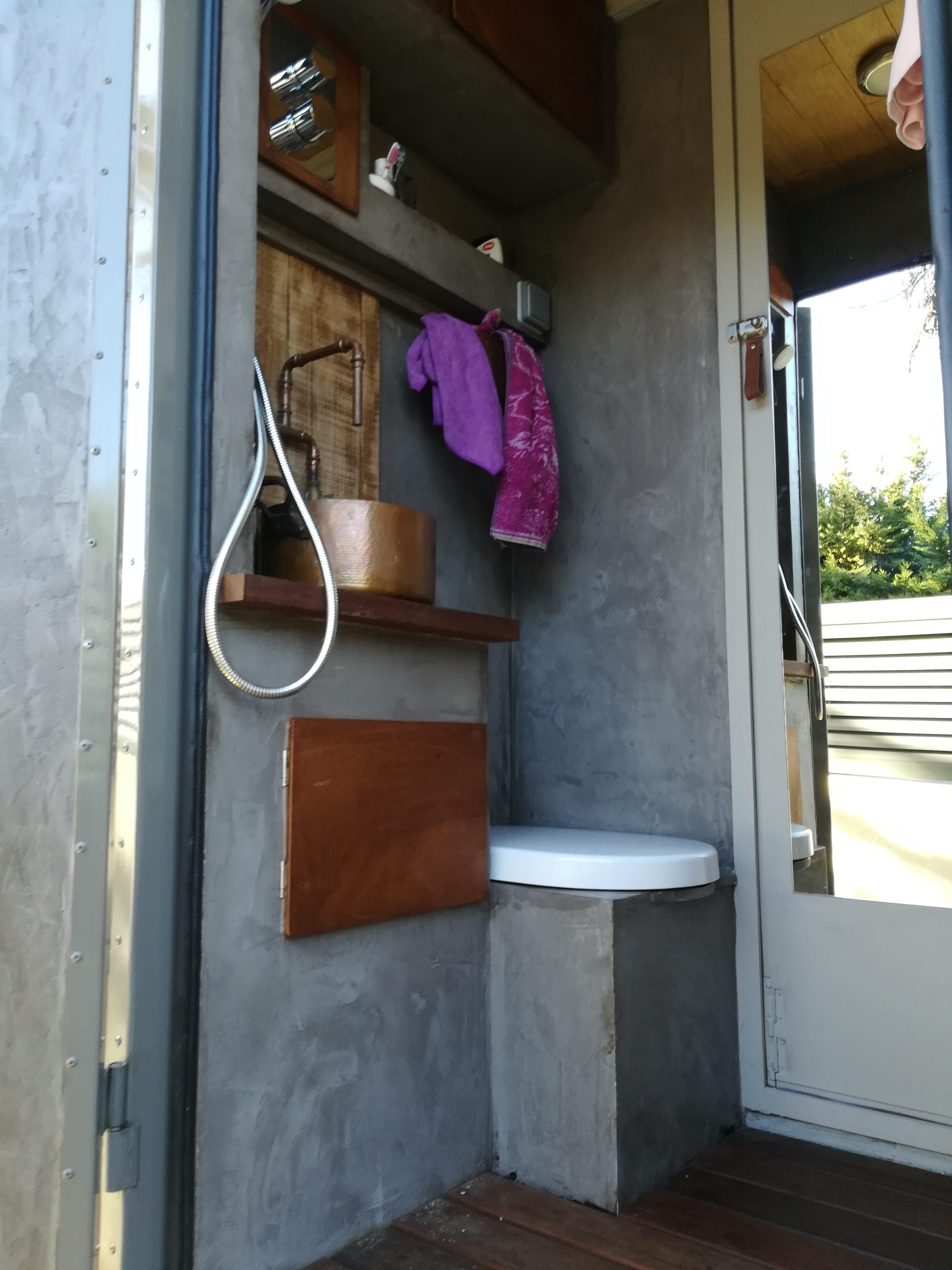 la salle de bain avec sa propre porte qui permet d'aérer rapidement, ou de prendre sa douche avec vue........les toilettes son des toilettes sèche, je suis en train de faire une modification pour mettre un séparateur d'urine ..les photos suivront.