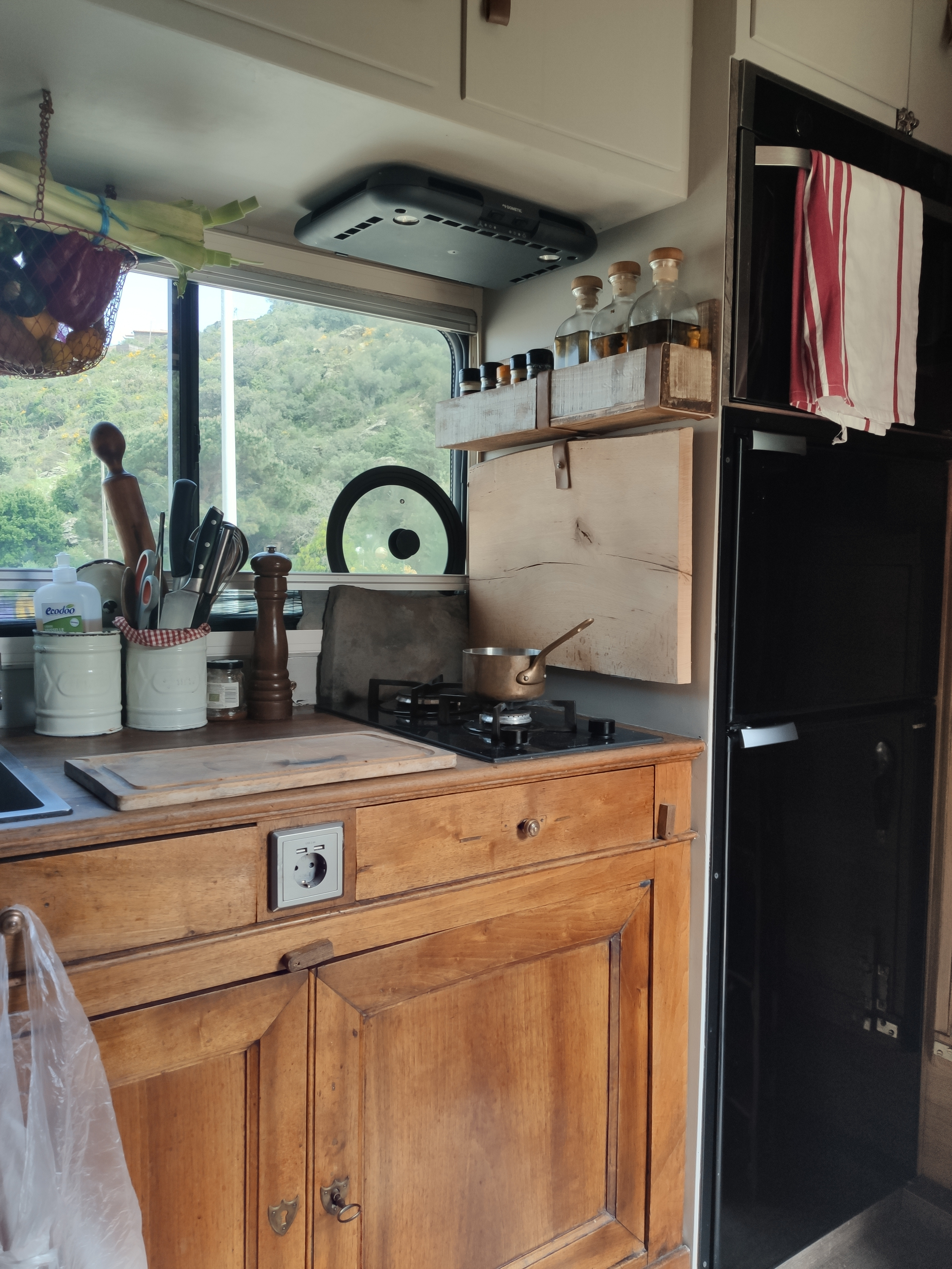 après il a tout l'équipement d'un grand..station de filtration 'd'eau, électricité, groupe élec, double antenne wifi, antenne 4g, etc etc.....tous les meubles et placages ont etat fait en contre plaqué marine car plus solide dans le temp, pour l'isolation j'ai d'abord projeter du liege sur toute la structure et panneaux pour éviter la condensation et je peut vous dire que je n'ai aucune goutte ni transpiration dans le camion grâce a cela...