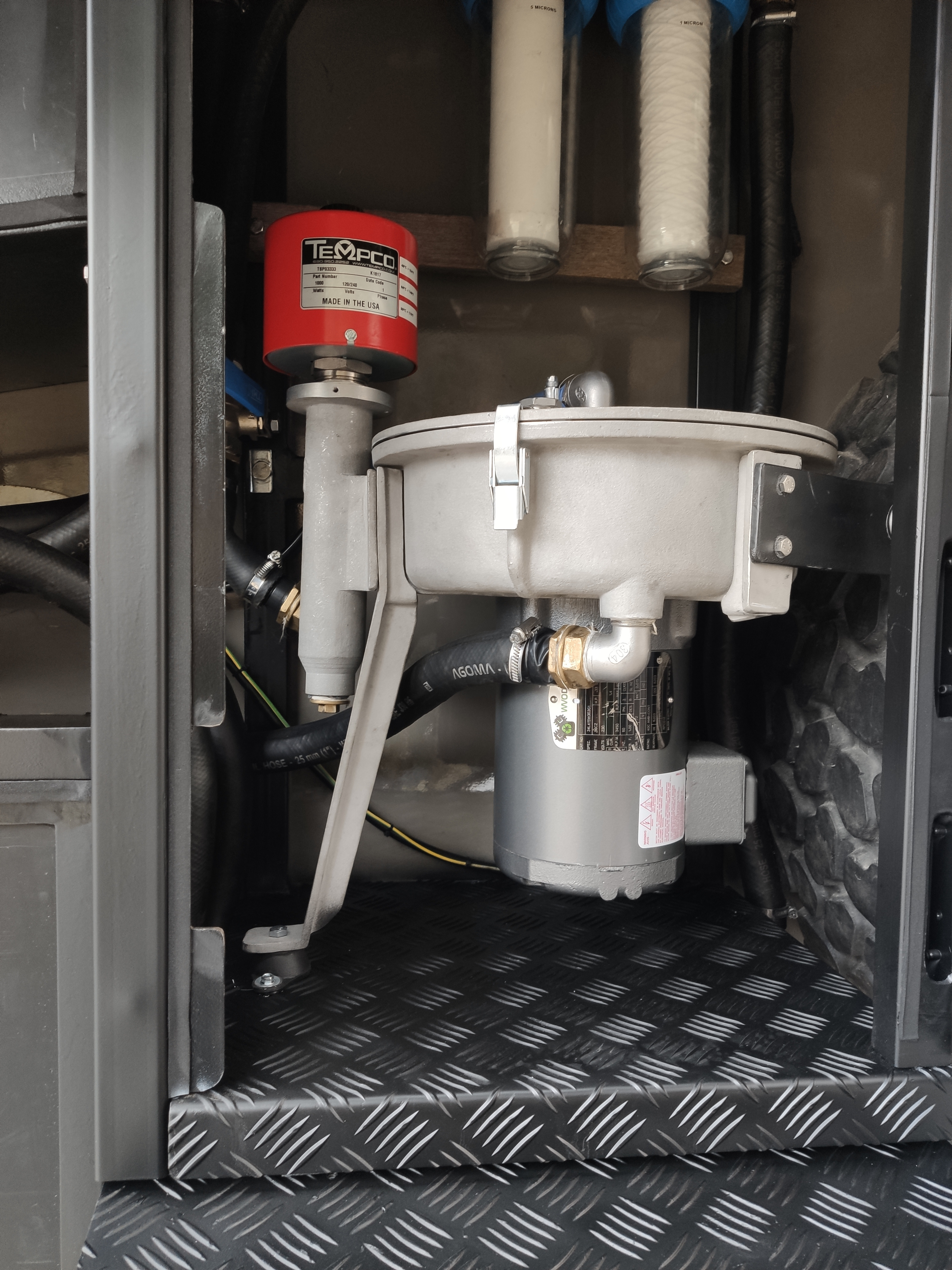 l'huile sale que je laisse dans un bidon par terre et aspirer par la première pompe (j'ai mis un petit filtre pour éviter les morceaux avant la pompe...), et vas dans le réservoir du haut, ensuite par gravité, l'huile descend dans la centrifugeuse muni d'un réchauffeur ci nécessaire, et de la centrifugeuse vas dans le reservoir du bas, la la pompe vas pousser l'huile a travers deux filtre de 5 et 1 micron et ....jusqu'au reservoir dedié a l'huile coté gauche de mon camion.