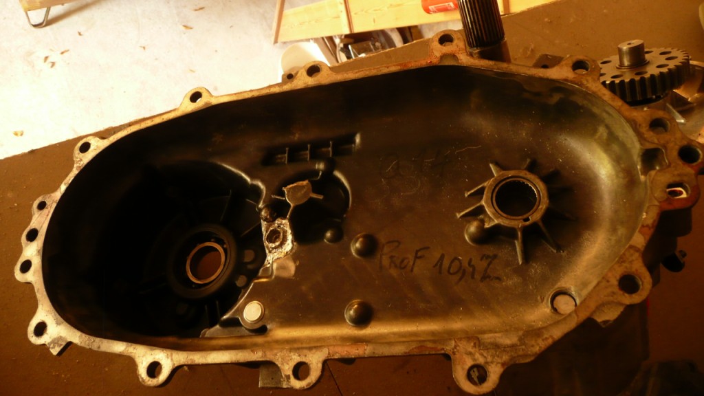 - de plus près on constate qu'un bossage a été entamé probablement par une chaine détendue et surtout qu'ils ont rechargé d'alu pour tenter un lamage de guidage de la fourchette de sélection...