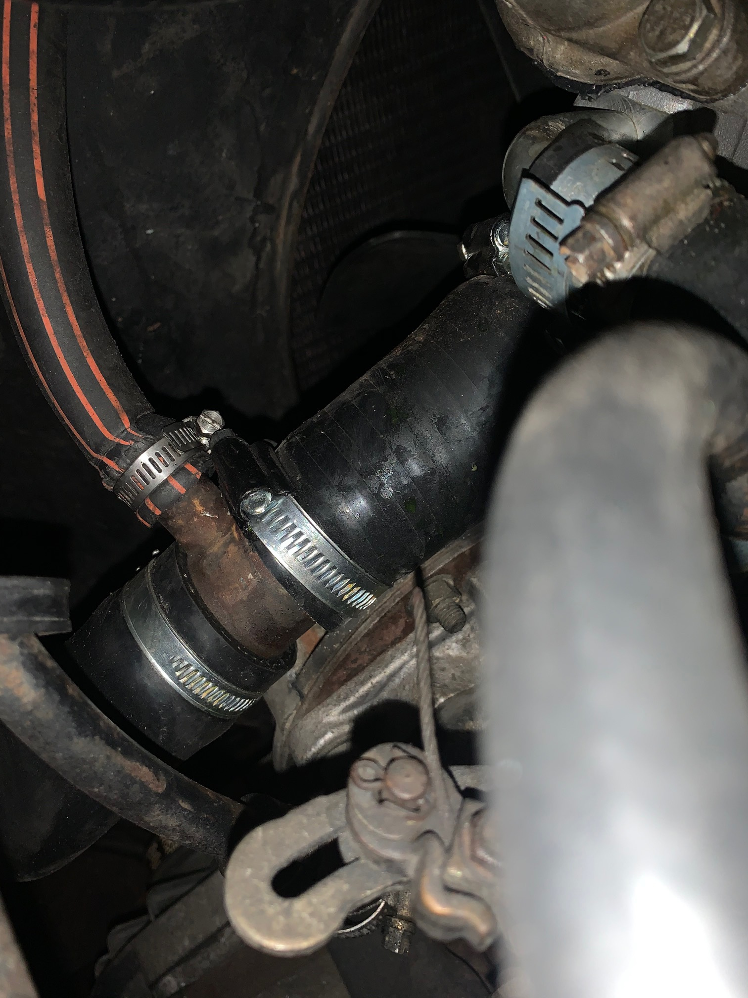 Ce qui pose problème, c'est le tuyau noir avec des rayures rouges. Il part en T après le radiateur et monte dans la vase d'expansion (qui, sur le modèle 4 portes se trouve dans le tableau de bord).
