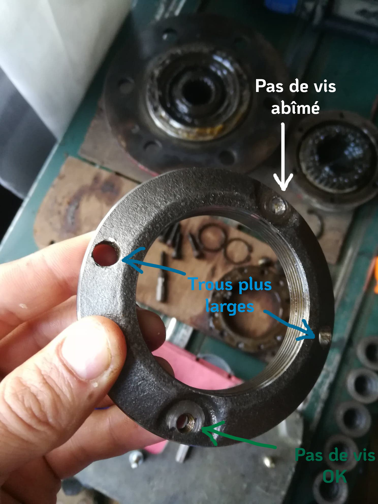 J'ai dû percer dedans pour l'enlever et le pas de vis n'a pas très belle allure. L'écrou à créneau à un deuxième pas de vis identique diamétralement opposé que je devrais donc pouvoir utiliser, comme on peut le voir sur cette photo :