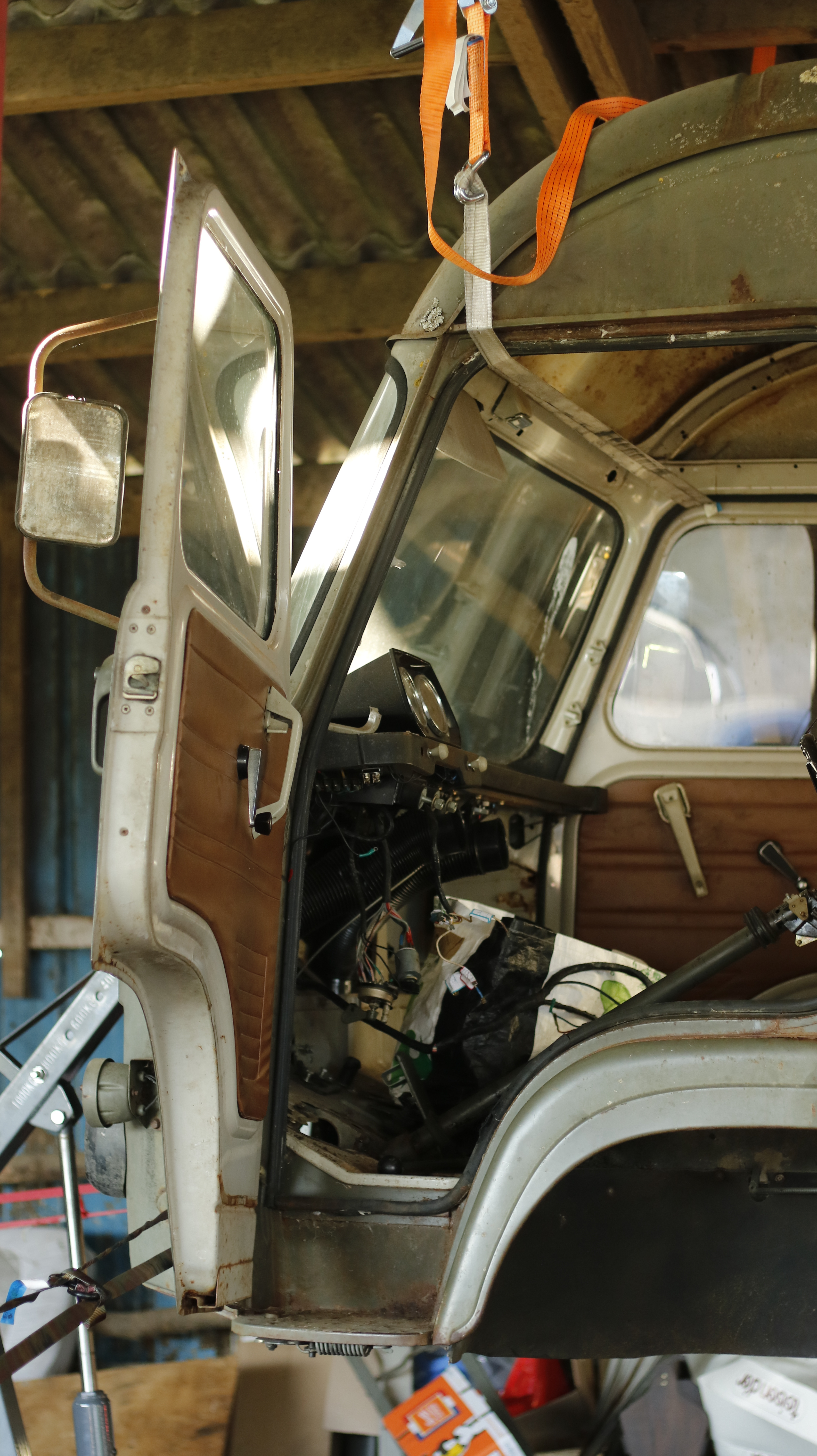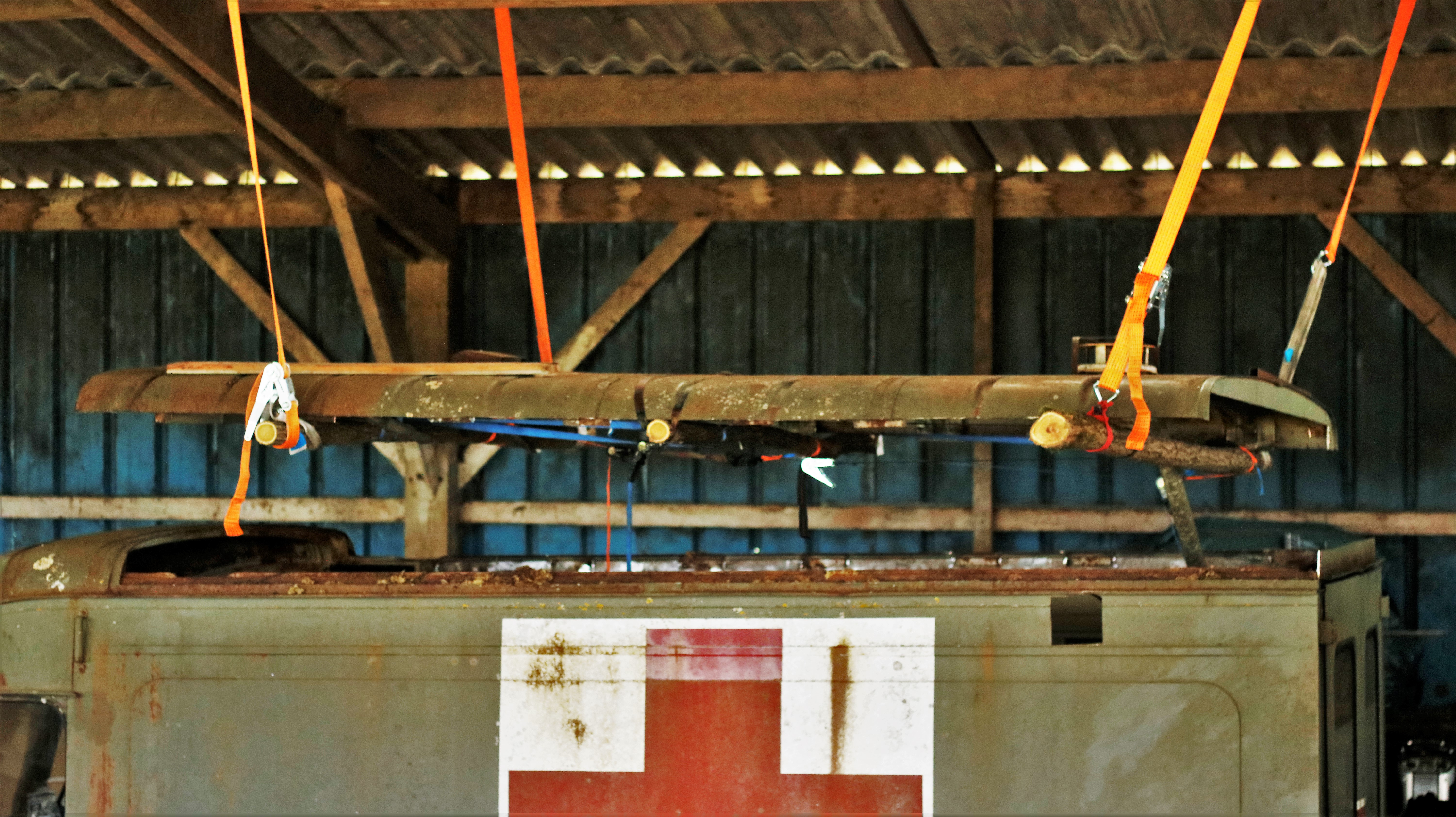 Nous avons donc soulever la caisse grâce à une chèvre à l'avant et deux criques à l'arrière. Pour sécuriser la montée et surtout la descente, j'ai installé deux sangles : 1 à l'avant et 1 à l'arrière du camion. Cela m'a permis de maintenir la caisse à hauteur pour retirer le châssis et c'était bien pratique pour enlever l'ancienne protection du bas de caisse d'un demi-siècle du TP.
