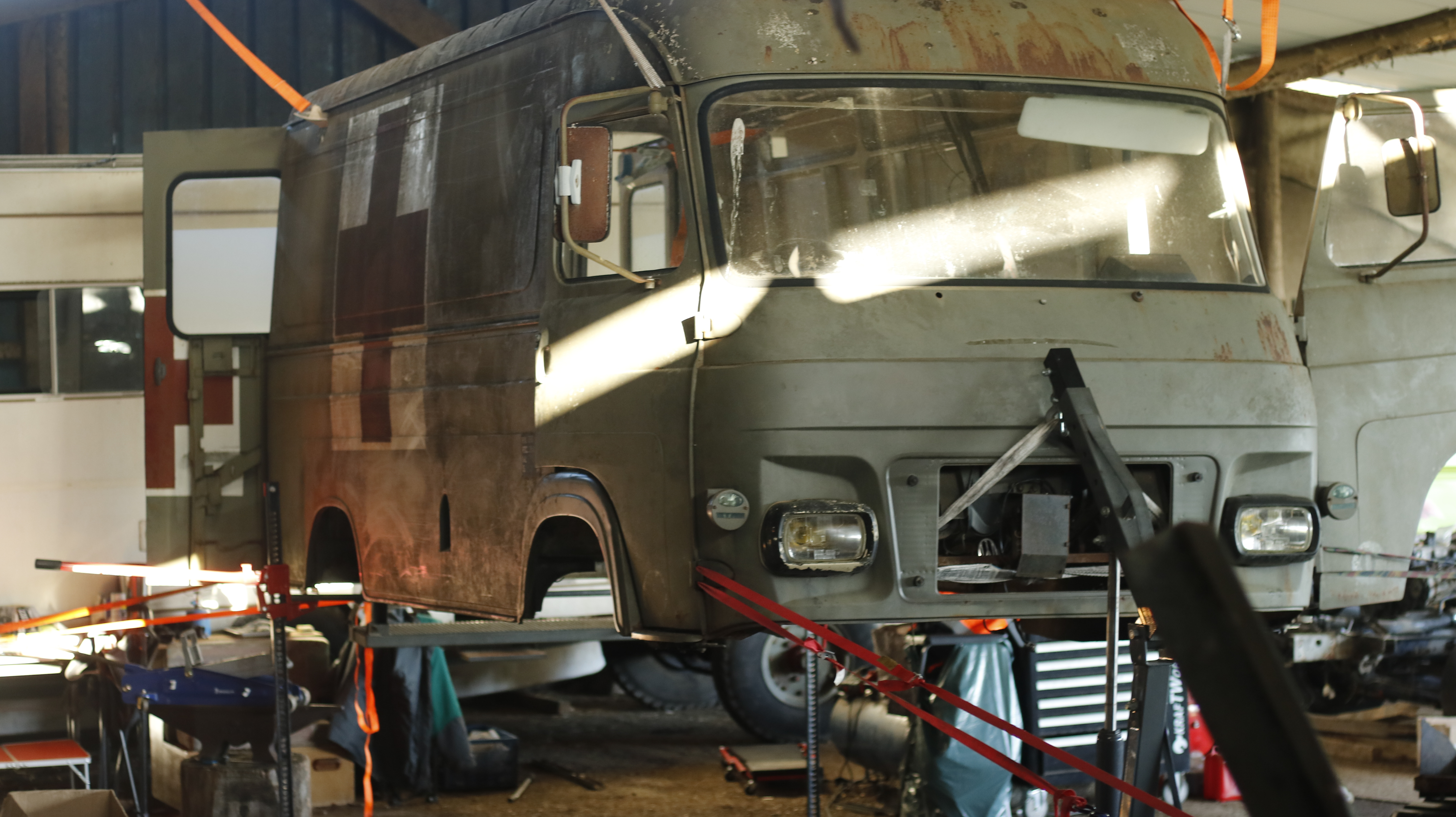 Nous avons donc soulever la caisse grâce à une chèvre à l'avant et deux criques à l'arrière. Pour sécuriser la montée et surtout la descente, j'ai installé deux sangles : 1 à l'avant et 1 à l'arrière du camion. Cela m'a permis de maintenir la caisse à hauteur pour retirer le châssis et c'était bien pratique pour enlever l'ancienne protection du bas de caisse d'un demi-siècle du TP.