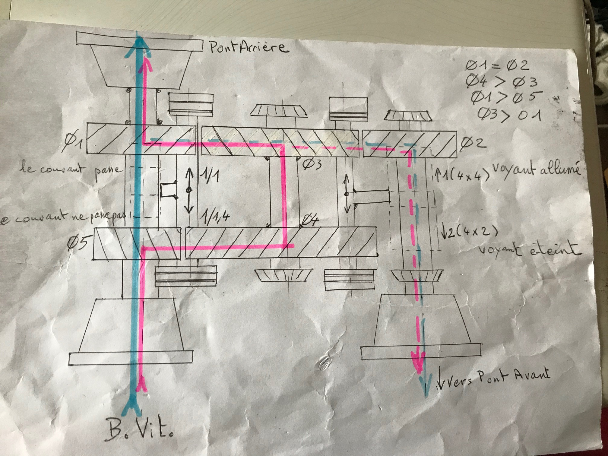 Les traits de Stabilo couleurs montrent le(s) cheminement(s) de la force motrice . Bleu en 4/2 , rouge trait continu en position réduction de 1.4 , et rouge pointillé en position 4x4 . A noter que l'on peut être réducté en 4/2 ou en 4/4 ...