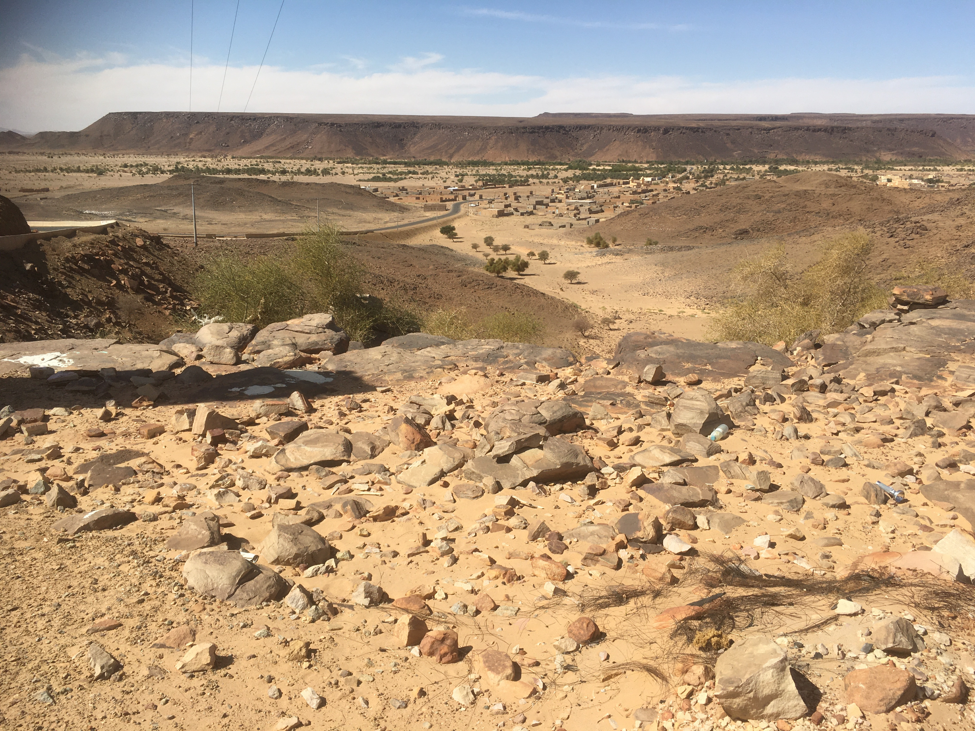 De Nouakchott à Atar, 500 km de ligne droite dans une étendue désertique mais variée. Des dunettes, de la steppe, des plateaux rocheux... des dromadaires, des chèvres, quelques ânes. Pas de superflu, l’essentiel. On quitte enfin la route pour suivre un oued asséché, puis une grimpette dans le sable. Le HiLux en 4x4 courtes, les Michelin sable dégonflés. Puis baskets et marche entre des blocs et dalles de roches jusque une « table » , un abri faisant apparaît des gravures rupestres encore bien conservées. Retour au Toyota qui nous dépose au bivouac proche d’une palmeraie. La suite se fera pour plusieurs jours à dromadaires pour les bagages, à pieds pour nous. De toutes façons en maints passages, un 4x4 n’aurait probablement pas pu passer (les dunes sont courtes, rapprochées, molles, ...). Nuit à la belle, ciel immaculé, silence sérénissime, spectacle grandiose pour s’endormir.