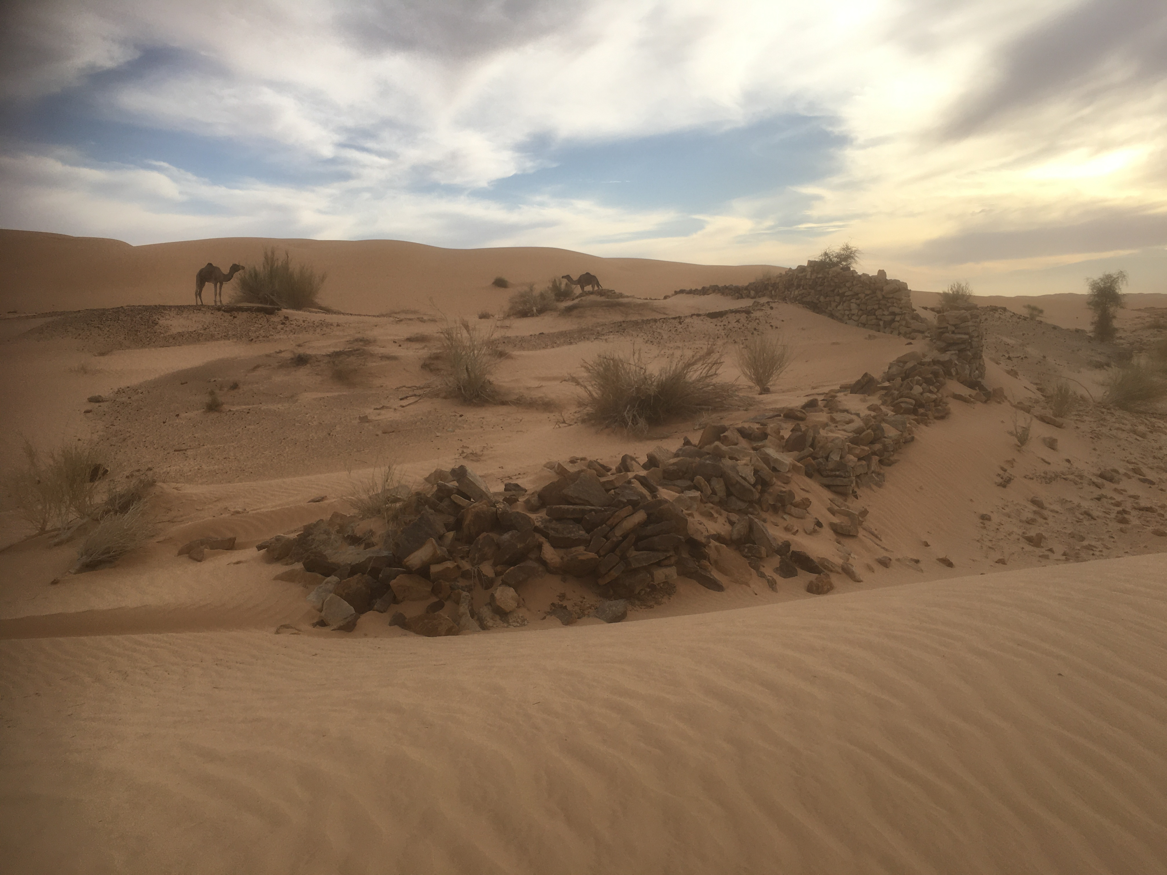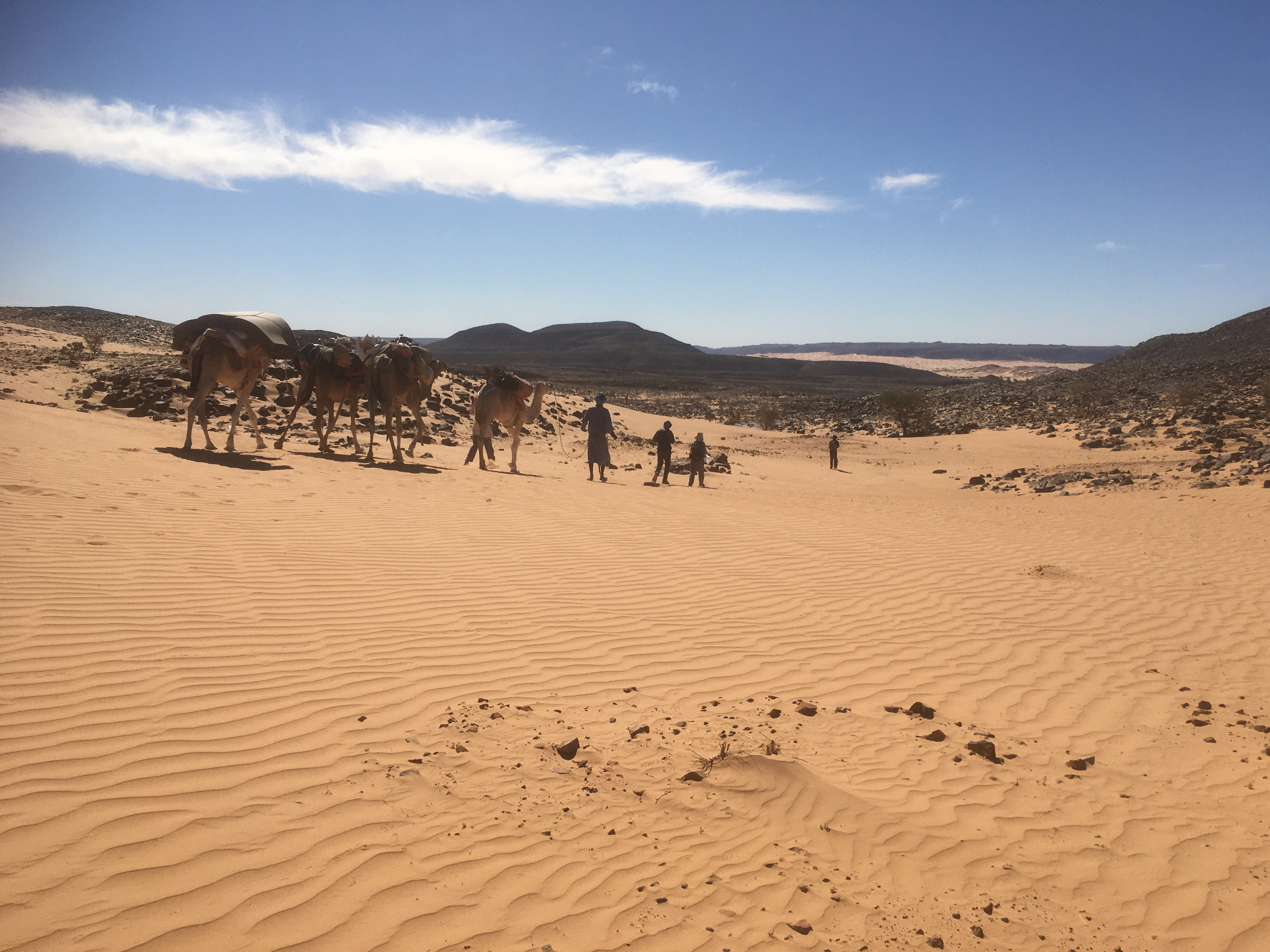 Des paysages encore aujourd’hui à couper le souffle. La traversée d’un village nous a rappelé que même ici dans cette contrée reculée et aride, il y a une civilisation. Avec son pire (maisons abandonnées, carcasses de voitures, déchets plastiques emportés par le vent...) et le meilleur (curiosité et spontanéité des enfants, simplicité et amabilité des hommes et femmes...). Et à nouveau des étendues de dunes immaculées, alternant du jaune à l’ocre, où nos dromadaires évoluent d’un pas majestueux, ils sont dans leur élément.