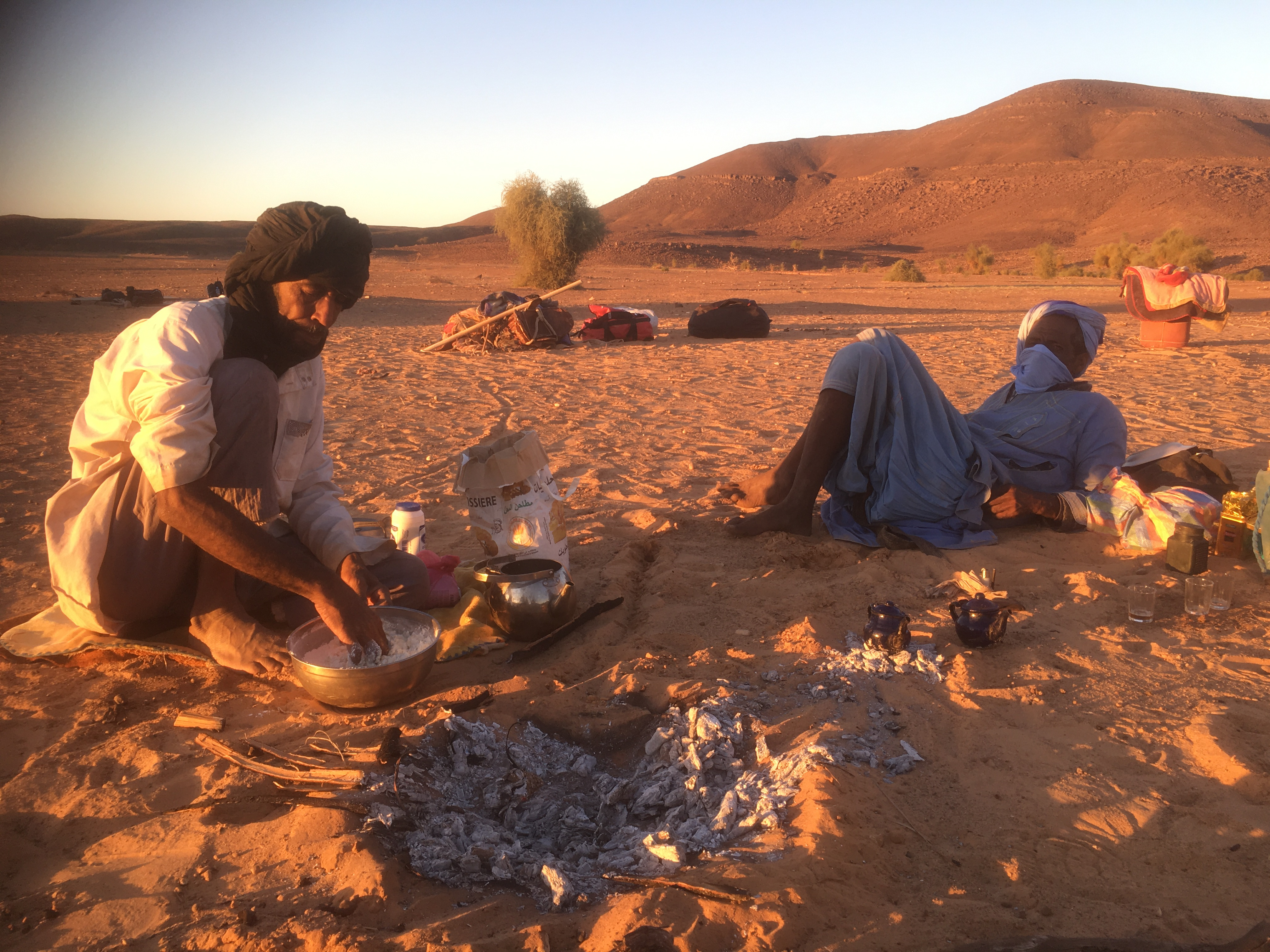 Le campement est sommaire mais organisé. Notre guide Ismaïl prépare le repas à base de légumes soigneusement emballés dans des linges pour les conserver. Nos chameliers Mohamed et Sidi allument le feu, préparent le thé et son cérémonial (3 collations successives), font de la pâte à pain et la cuisent à l’étouffée dans le sable (40mn thermostat « braises »). Pain frais tous les jours ! Je suis autant émerveillé par la beauté des paysages que l’ingéniosité de nos accompagnateurs qui font tant avec peu de moyens. Mais nous en faudrait il plus ?