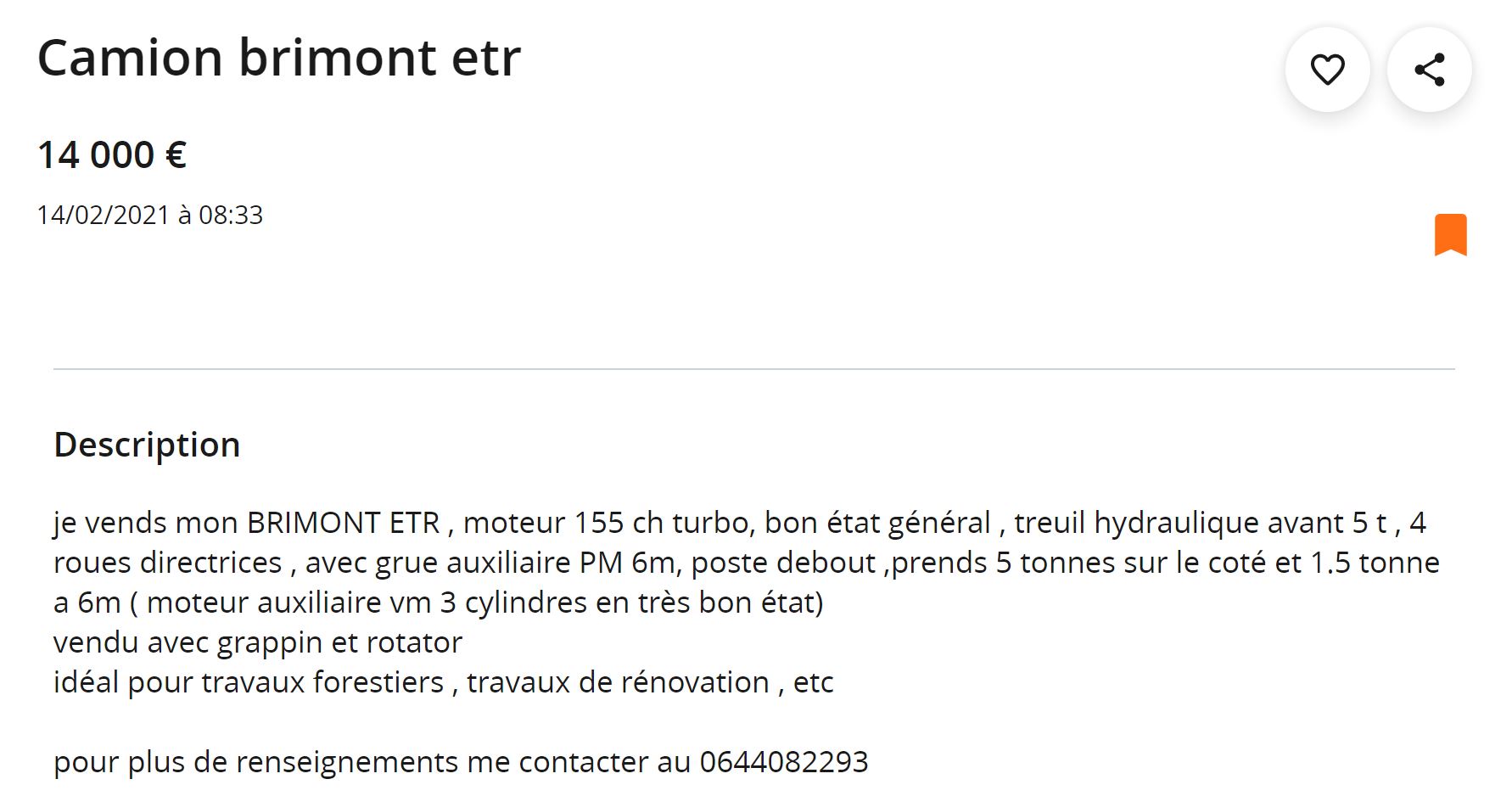Maintenant, le camion est équipé d'une grue, et je trouve le prix beaucoup trop cher, surtout qu'il doit avoir une carte grise de retard!