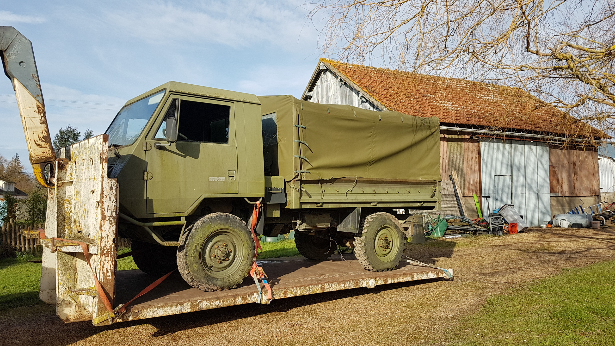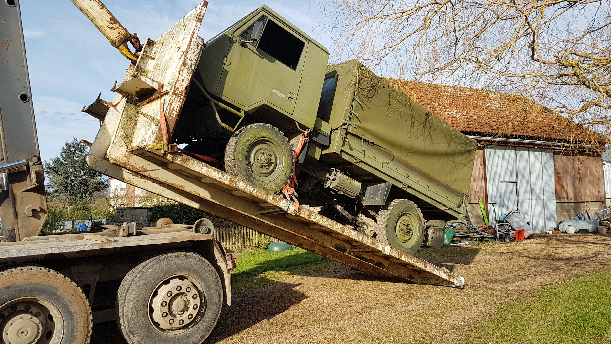 puis dechargement à la maison Quand on a remonté le plateau sur le camion porteur, l'angle d'inclinaison est assez impressionnant, mais ça le fait sans problème...