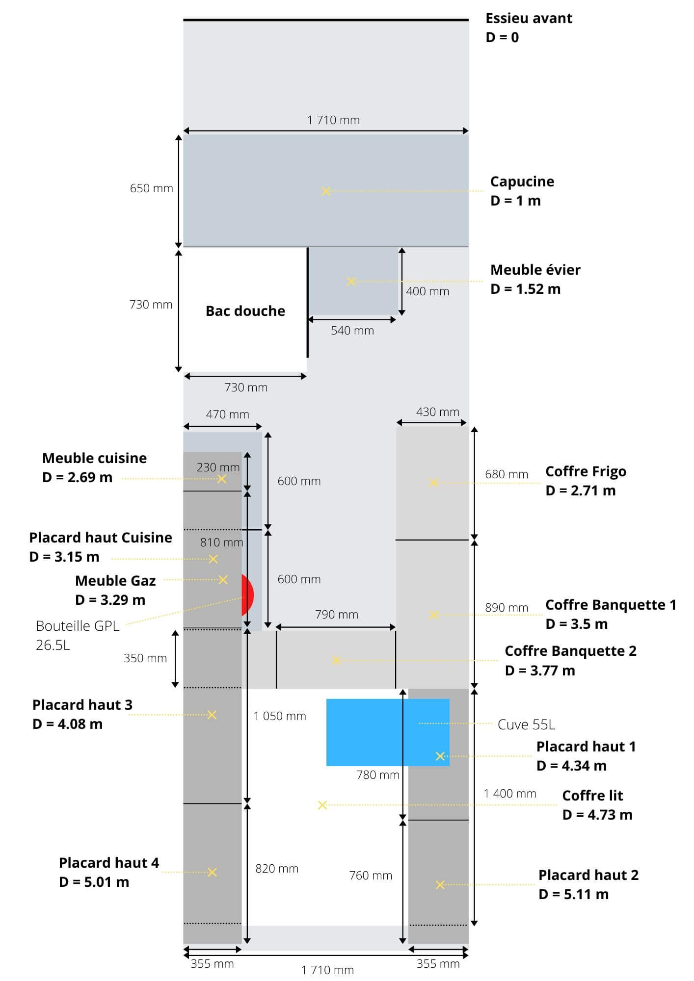 Bonjour à tous . Réponse pour Pat . Comme promis voici deux exemples , le tableau Excel de ma répartition des charges et un exemple de plan pour répartition des charges ce n'est pas le mien , car trop grand pour le scanner . Comme tu vois les coffres batteries porteur et cellule et le coffre gaz n'est pas à compter dans la répartition des charges ..... Retour de la DREAL pour l'instant . Le pare-buffle d'origine doit être homologué , le pare-branche pose question !!! Le treuil doit être protégé sur les parties saillantes .Les portes des coffres d'origines ne s'ouvrent pas dans le bon sens ,et ce n'est sans doute pas fini, J'ai quand même le récépissé de dépôt de dossier pour passer le contrôle technique . Je vous donnerai la suite au prochain épisode. A +