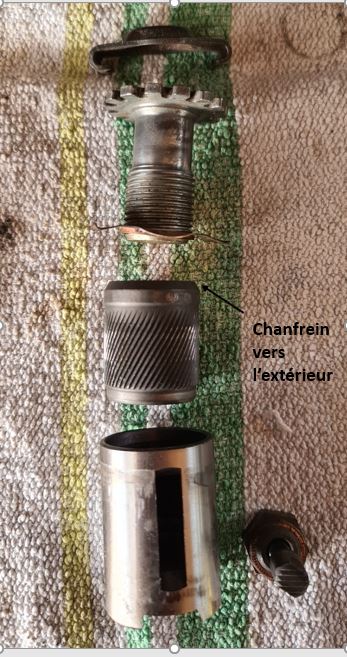 Voici le sens des pièces, le chanfrein de la bague doit être vers l'extérieur, on ne peut de toute façon pas la monter dans le mauvais sens, mais ça évite de tout ressortir plein de graisse pour retourner la pièce quand on ne peut pas la visser :(