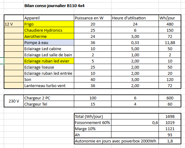 Je ne raisonne pas en watt mais en Watt.heure, grosse différence.new-one a écrit : 04 nov. 2021 13:22 Tout a déjà été dit sur notre fofo concernant ces bilans électriques. Mais il faut souvent faire de la spéléo pour regrouper les infos.