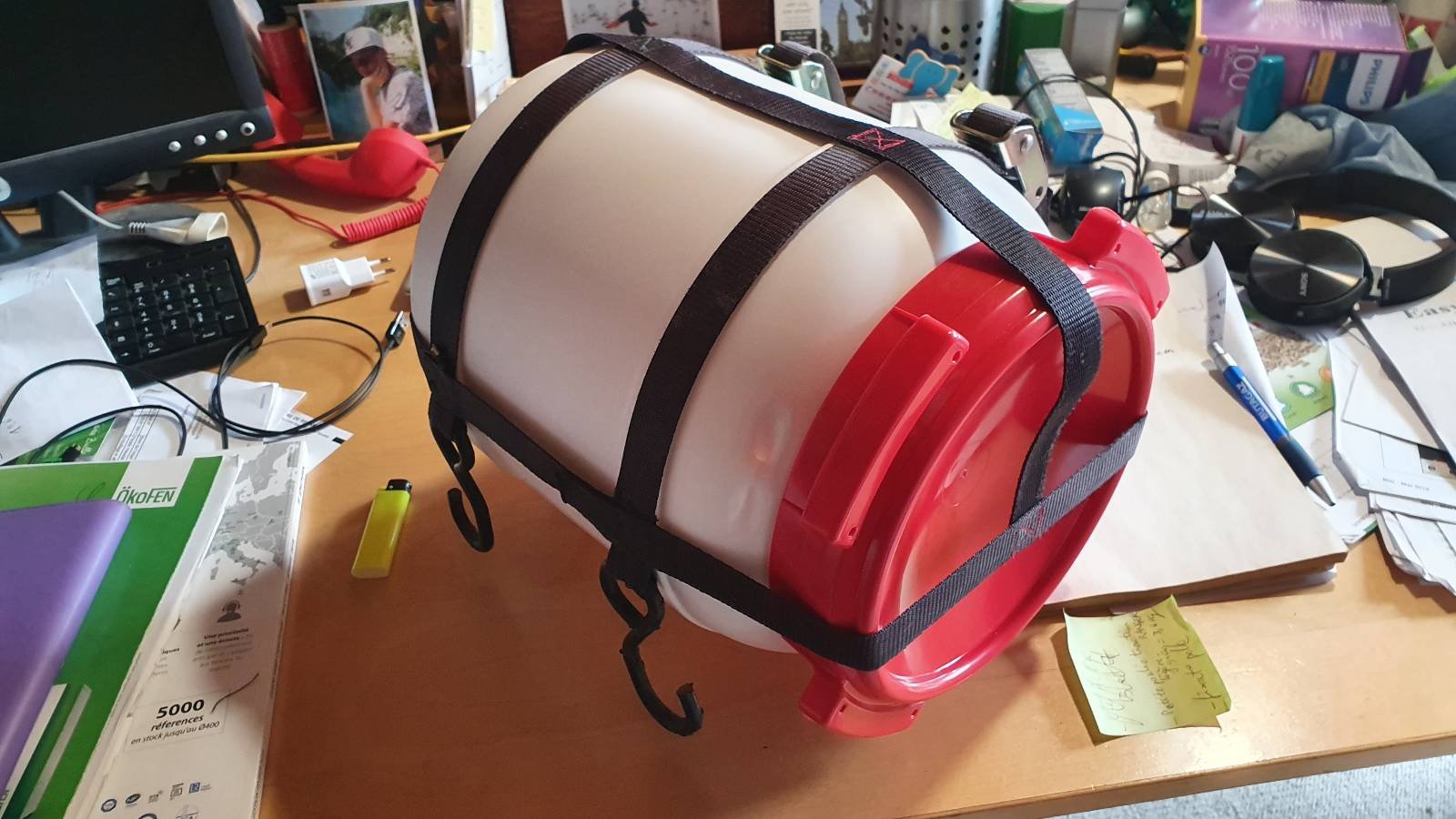 Et un bidon étanche avec sa sangle cousue sur mesure : le lave linge !