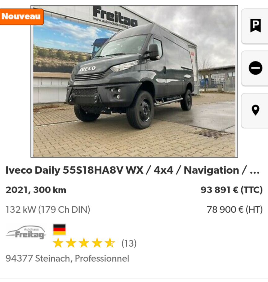 A ce prix là, on voyage quelques années autour du monde sans pb .. et encore il n'y a pas ll'aménagement. On devrait les voir sortir a facilement 150.000200.000 euros en version "camping car" .. des montants qui me dépassent complètement (ce n'est pas vraiment une critique, plutôt que c'est tellement hors de mon "monde réel").