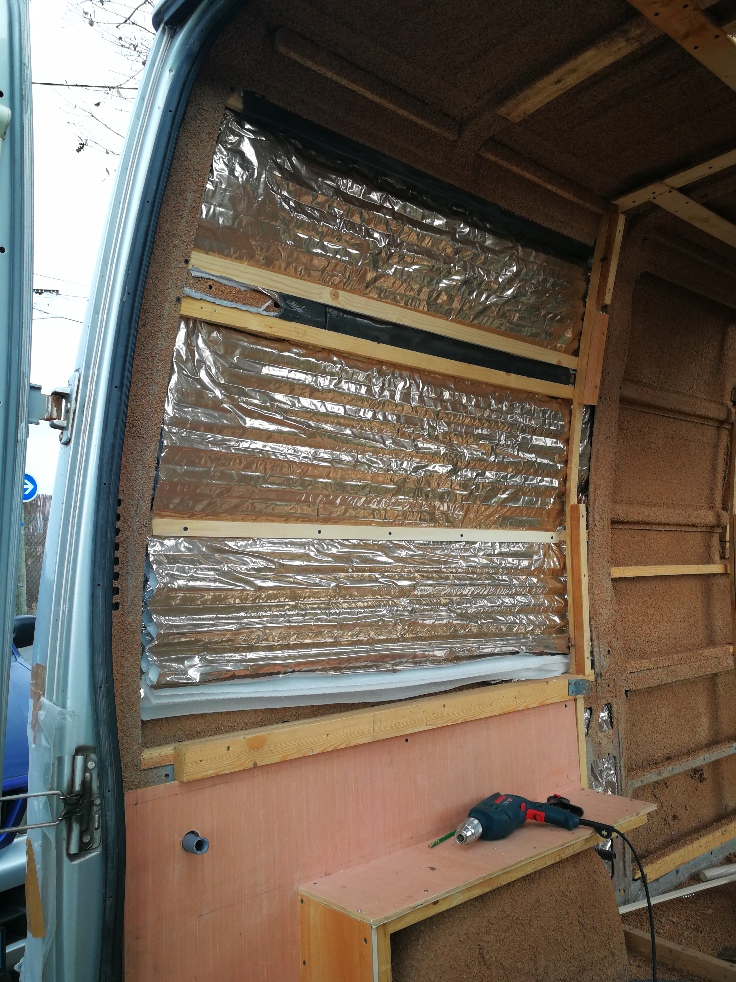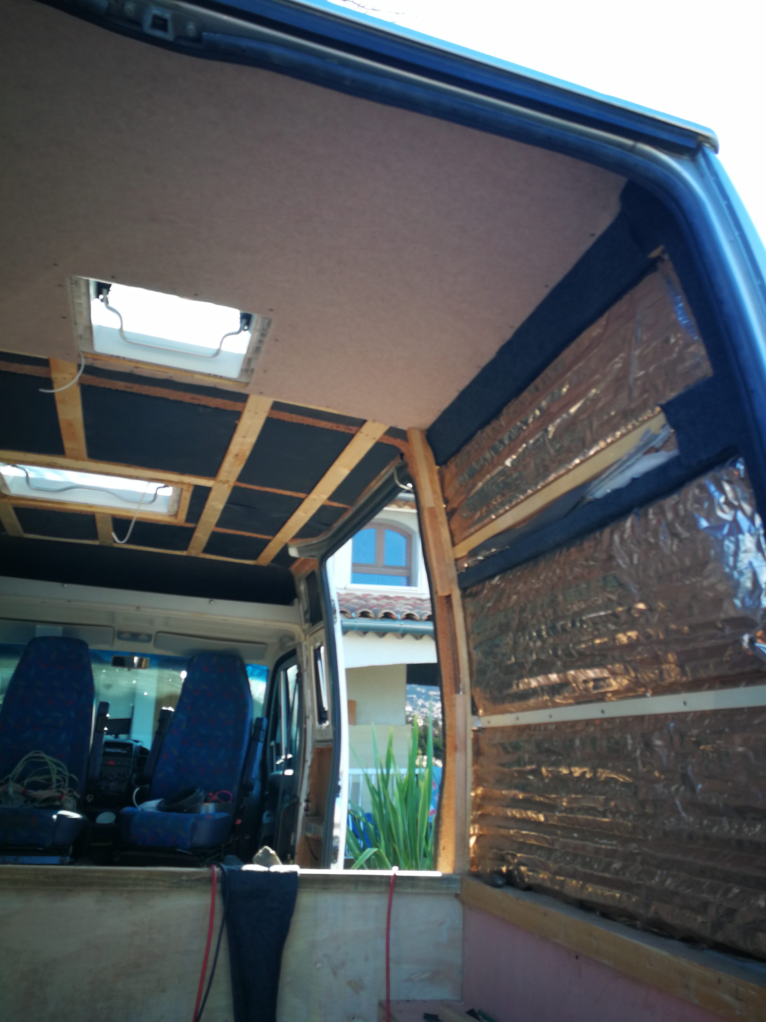 J'utilise ce que j'ai récupéré du fourgon (le fourgon était mal isolé, un peu d'armaflex en faible épaisseur) sur le plafond, moins épais que sur les parois. J'ai acheté de la mousse isolante aussi en 2 centimètres, par erreur, mais finalement c'est parfais au plafond.