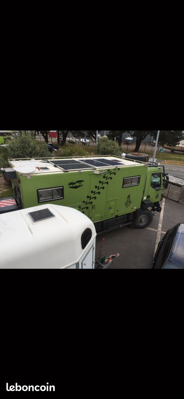 "Camion Renault midlum 4x4 vasp 7m80 .12t ptac .7,5t en ordre de marche en très bon état. Aucun frais à prévoir prêt à partir.conso 24l/100. CT ok . Porte moto simple ou double (400 kg )sur treuil avec coffre. Galerie sur cabine. Treuil elec. Attelage.3 blocages.5 pneus en bon état. Réservoir GO 300l plus 3 fois 20l. .eau claire 500l.eaux grises 150l.wc chimique 35l.chauffage cellule sur chaudière GO.et échangeur depuis camion .eau chaude depuis chaudière GO et 220 v sur panneau solaire.(chauffe eau neuf )plaques deux gaz , four à gaz . Bouteille 13 kg. Micro onde 220v.depuis convertisseur vectron 3kw . 500w de panneaux solaires vers 2 batteries stationnaires neuve.deux circuits d eau (dont 1 avec cartouches de traitement) Tv avec antenne satellite 80 cm entièrement automatique. Un couchage permanent 140/190 . Un couchage coin repas 2 personnes . Nombreux placards ( aménagements très costauds bois massif) coffre fort.. Cabinet de toilette avec douche et lavabo. +douche extérieur avec thermostatique. Fenêtres et hublots avec moustiquaires et occultation, nombreux coffres extérieurs .ect …. Dossier sur internet ( voir Renault PANTANAL). 4 Amortisseurs scorpion a bonbonnes séparées sur mesure. 2 amortisseurs scorpion sur mesure pour la cabine. Treuil pour descendre où monter là roue de secours. Entretien sérieux du moteur : démarreur neuf .batterie neuves. Compresseur à air neuf .vidange boîte pont et réducteur faites. Moteur dans 10000 km . Plus d informations sur demande .dimensions de la cellule ( 5m/2.40/1m86 de haut) (passage cellule cabine) "