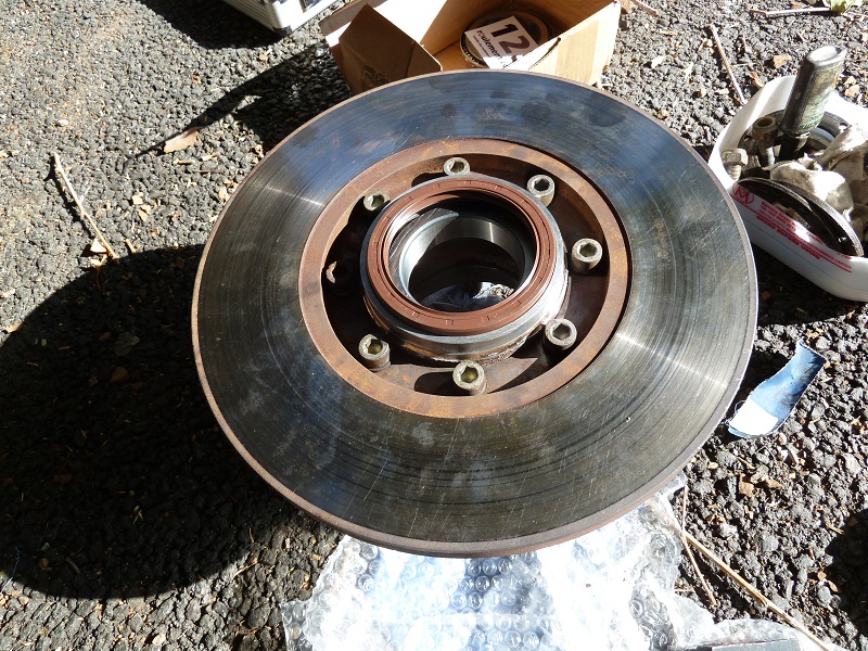 6) maintenant vous pouvez attraper le moyeu dans son ensemble avec le disque de frein et tout faire venir vers vous (attention ça pèse un peu) une partie des roulements conique risque de tomber se n'ai pas grave. retirez un maximum de graisse pour voir à l'intérieur du moyeu car il faudra retirer les parties femelles des roulements coniques. déposer le joint spi coté disque de frein (il faudra bien sur le changer également). Les parties de roulements femelles dépassent légerement de leur appui il suffit de les chasser par l'intérieur du moyeu un fois dans un sens et une fois dans l'autre (car il y a 2 roulements coniques par moyeu)
