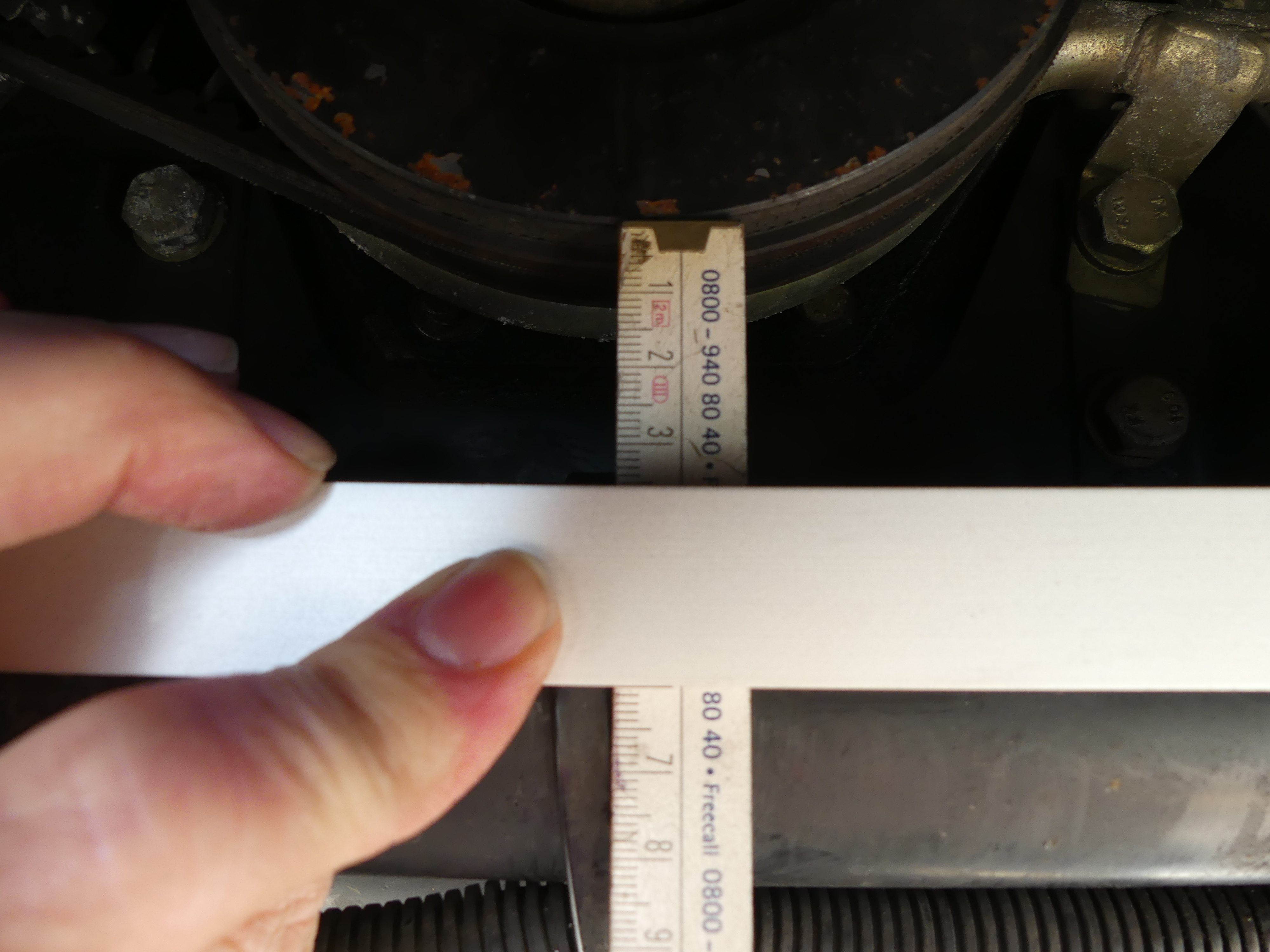 Hier habe ich eine Leiste von unten an den Rahmen gelegt und den Abstand zur Riemenscheibe ermittelt.