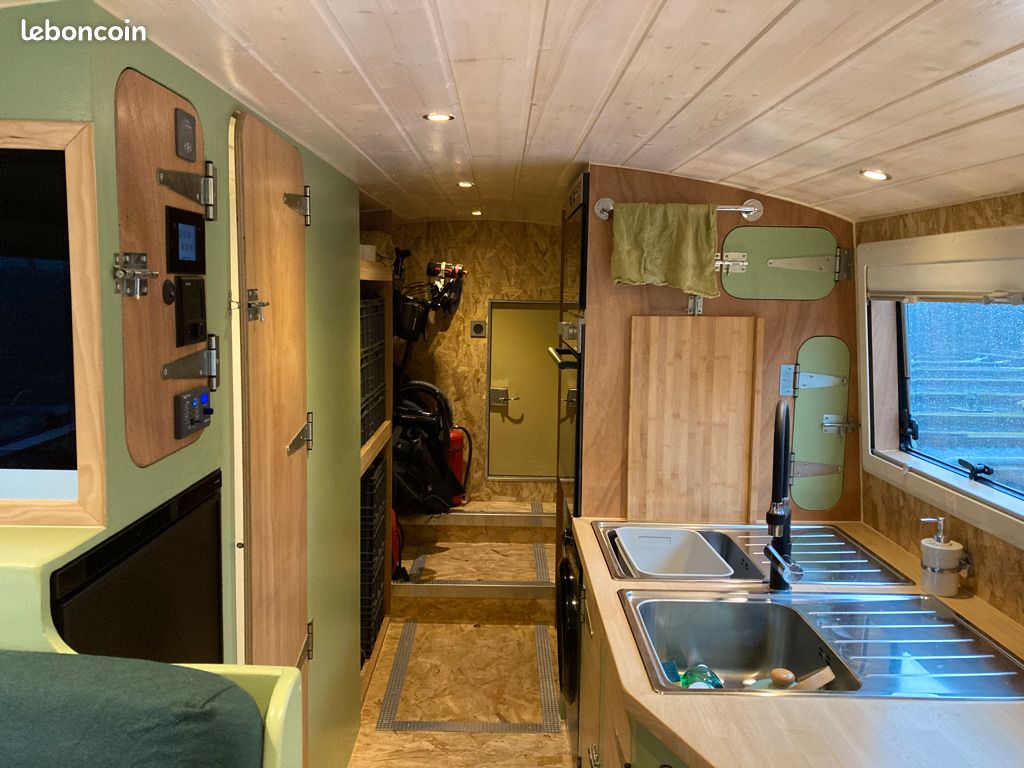 Equipements: plaque induction, four, MO, lave linge, sèche linge, robot Magimix, extracteur de jus, ordinateur de bureau Mac intégré au mobilier, routeur Oyster. Pas d'installation gaz. Frigo Thetford 12 volts 150 litres.