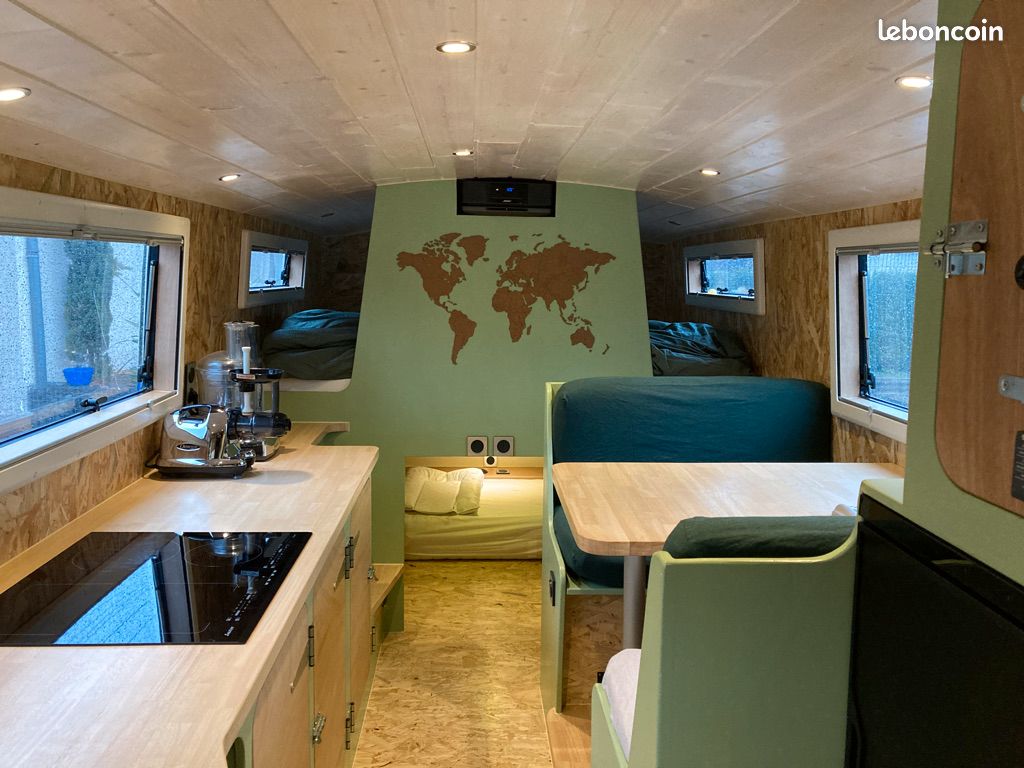 Cellule Néoplan mise à nue , totalement isolée (6 cm au plancher, 7 sur les paroies, 6 au plafond) et reconstruite en OSB et contreplaqué ctbx collé au silicone polyuréthane et vissé. Travail soigné et solide. 20 M2 au sol avec sdb et toilettes séparés, grand espace de vie très lumineux et 2 espace nuits séparés (un très grand lit double/triple, et une chambre enfant avec lit simple pouvant être modifiée en deux lits simples...)