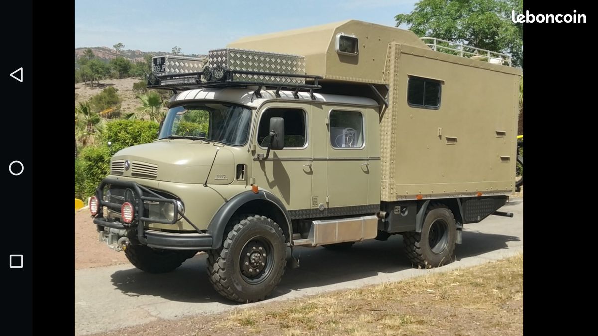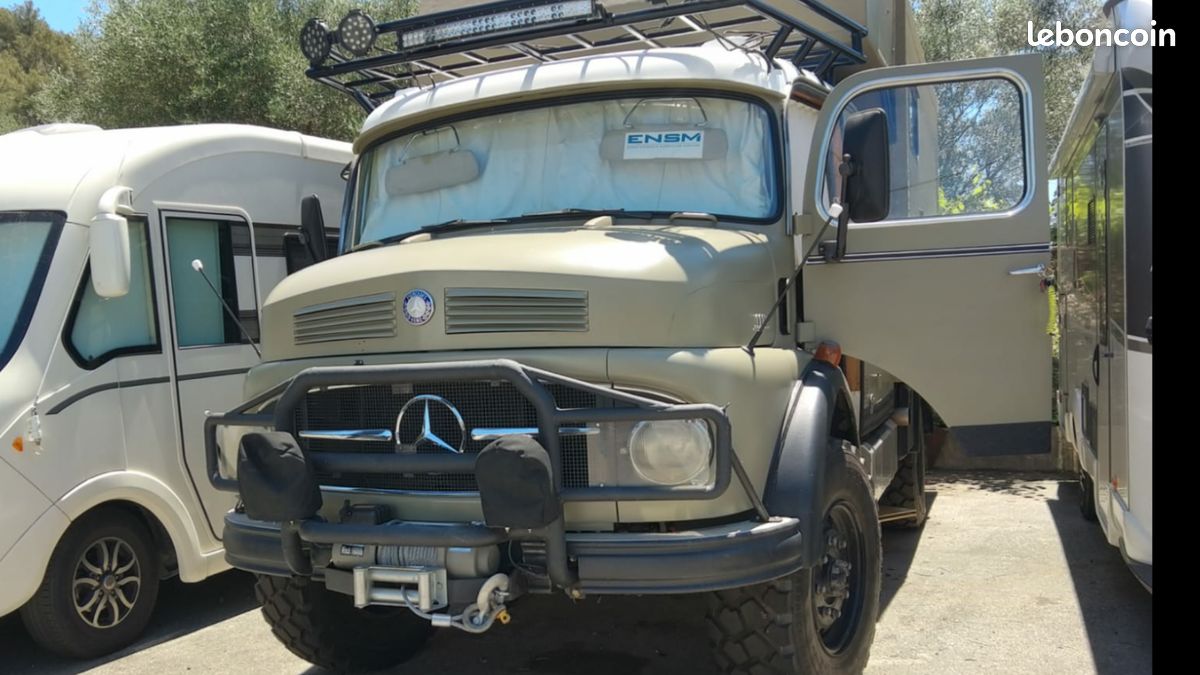 "Bonjour, alors c'est un Mercedes 1113 de 64. 4x4, 52000 km châssis, moteur changé pour un modèle OM 352 refait entièrement par un dieseliste, (facture) actuellement 20000 km, embrayage 20000km, radiateur a faisceaux épais, (10 cm) ouvert et vérifier il y a 20000 aussi, liquide refroidissement Evans (sans eau, point ébullition plus haut, pas de pression dans le circuit) , durite silicone, decanteur gasoil parker a cartouche, double réservoirs gasoil en aluminium cloisonnés (sur mesure), 2x230 litres avec pompe de transfert, treuil electrique 8 tonnes, batteries gel x2 de marque concorde (3 mois, 700 euros), frein refait, 9000 km, garniture mâchoire sur mesure riveté, récepteur complet x4 changés, émetteur joint changé, durites frein aviation, snorkel aluminium avec tête cyclonique Donaldson, longue portée pare buffle, bar de led et 4 phares led sur porte bagage toit, caisses aluminium étanche qui ferme à clefs, joint pare brise changé il y a 4 mois, peinture récente, sièges avant recaro golf 2, pneus Michelin x force, arrière (2021) , avant 2020, en très bon état. Treuil arrière 350 kg (pour la roue de secours) jantes renforcées Michelin, faux châssis arrière 3 points, (2 silentblocs et un axe en 30 mm sur paliers) , caisse arrière aménagé, et isolé (airflex et styrodur pour le sol) , peinture cellule en raptor, 2 réserves d'eau (120 et 140 litres avec vannes pour choisir, chauffe eau Leblanc démarrage instantanée ( pas de veuilleuse) , double bouteilles de gaz, deux panneaux solaires 2x150w avec régulateur mppt victron energy, 3 batteries Varta gel 110 amp, petit coffre fort, 2 TV led DVD, nombreux placards, chauffage gasoil auxiliaire a télécommande, frigo trimixte qui sera changé, douche séparée de grande taille avec fond teck et inox et porte double transparente, plaque a gaz inox 2 feux, hotte aspirante, table a manger coulissante 4 sens (pour réglage), réservoir eau grise 150 litres, tableau électrique avec surveillance énergie boîtier écran couleur BEP, etc.... Véhicule en ma possession depuis 12 ans, testé en Afrique de l'ouest dans diverses conditions."