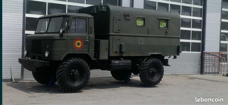 "Camion militaire russe, GAZ 66, année 1975, stocké par l'armée, 1067 km à bord, conservé dans la graisse d’usine , inutilisé, immatriculé comme voiture d'époque (colection), moteur V8 de 5000 cmc (5litres) essence, différentiels verrouillables 4x4, les roues peuvent être gonflées à la volée, emplacement pour un petit groupe électrogène, emplacement pour un gros groupe électrogène sous la cabine, entraîné par un cardan, diverses options pour un usage militaire. Le fourgon est en aluminium.