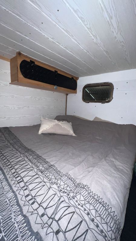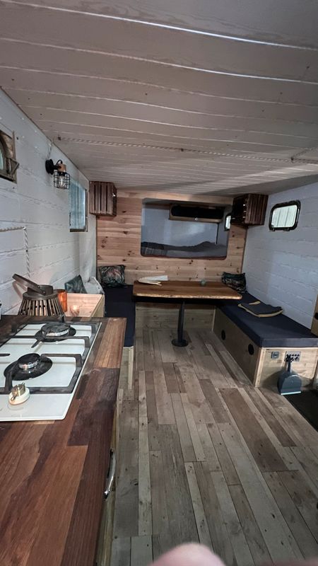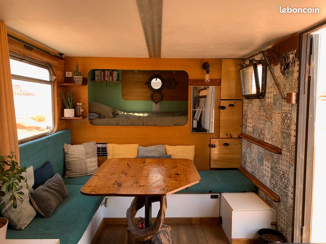 Grande table, camion très spacieux et confortable, idéal pour de longs voyages ou pour y vivre à l’année