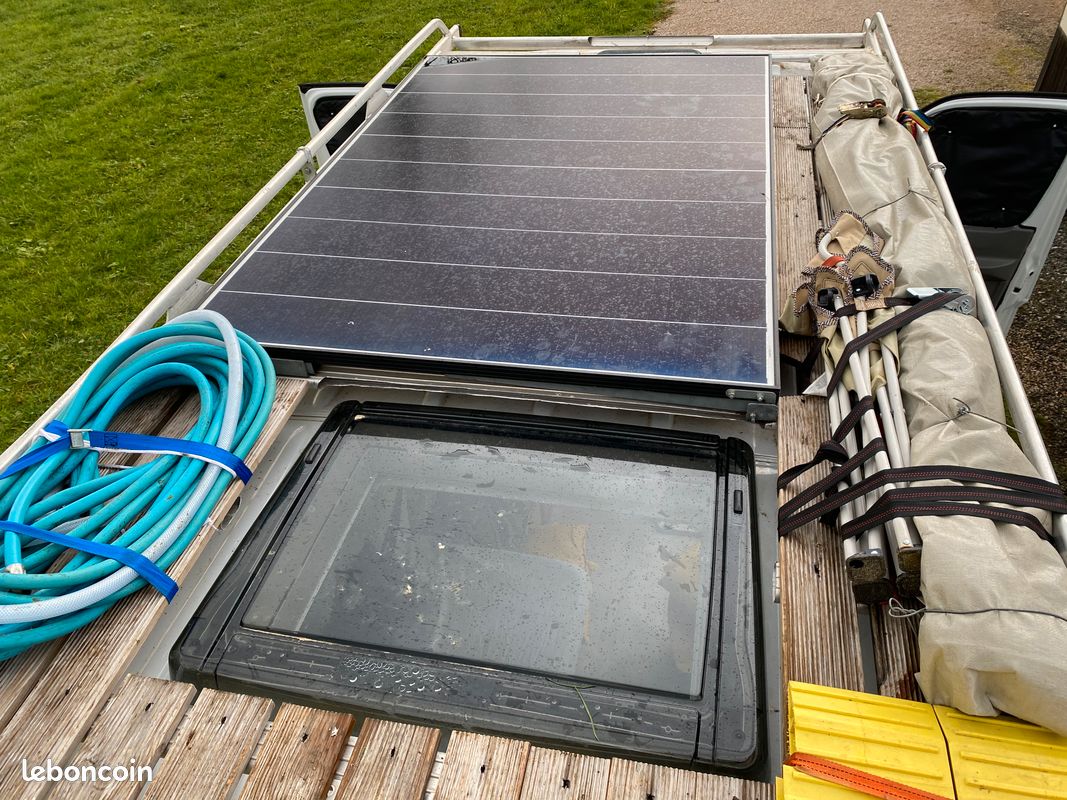 Sur le toit : galerie en aluminium MTS, plancher teck à l'arrière on peut prendre le café assis et le long du panneau solaire je sangle l'équipement extérieur tapis, toile et piquets.