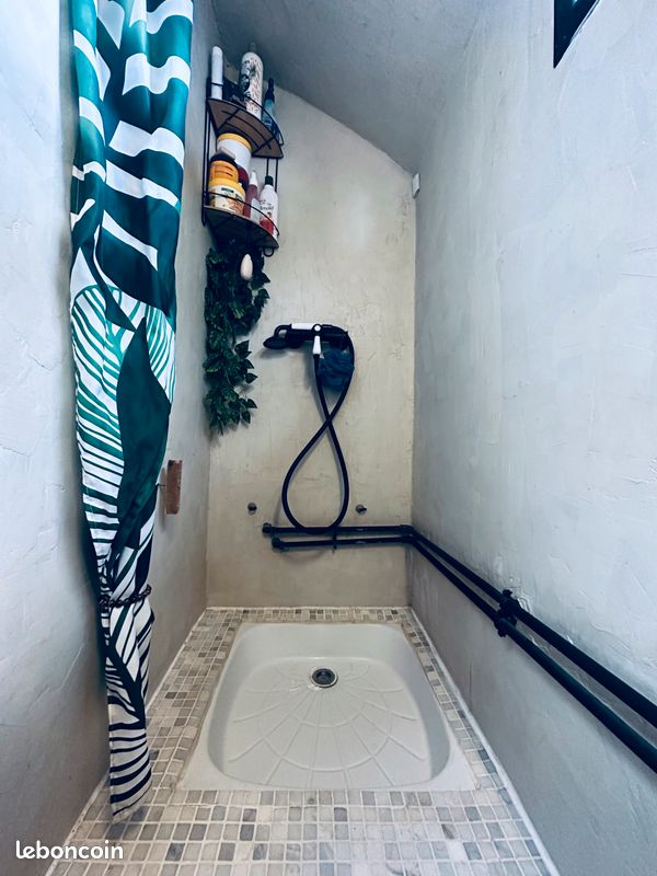 Une douche type maison Jacob Delaffont avec toilettes sèches à séparation Boxio et lavabo.