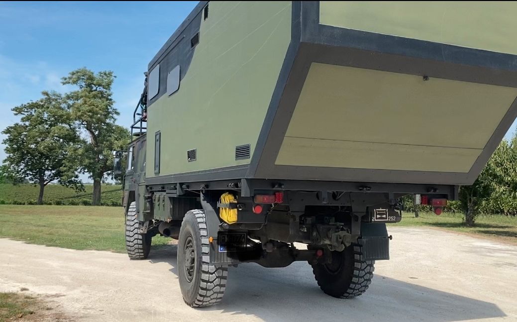 Sur ce porteur une cellule légère en poids mais solide. Parois de 9 à 10 cm d’isolation avec armature complète en acier inoxydable. Angle de sortie énorme.