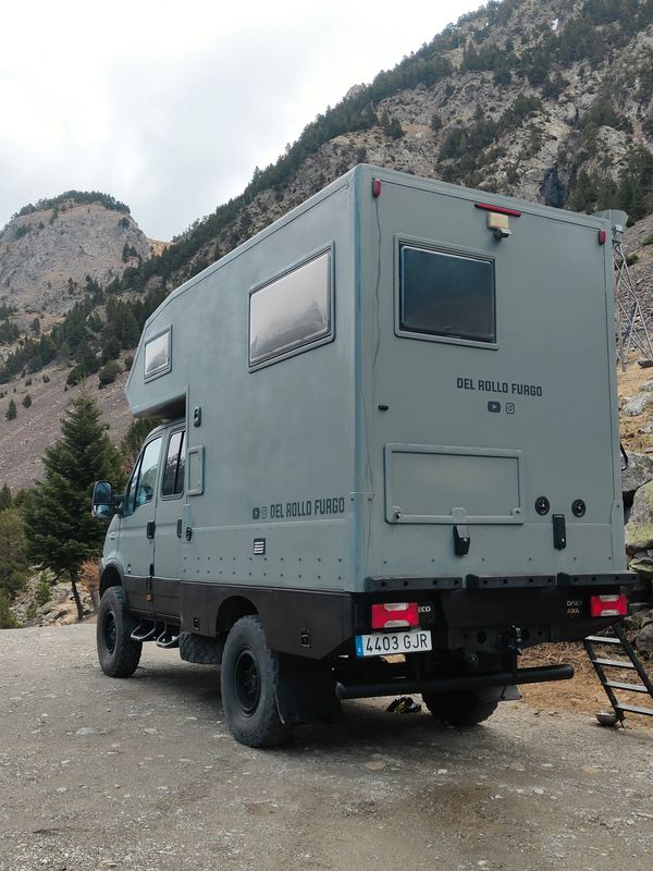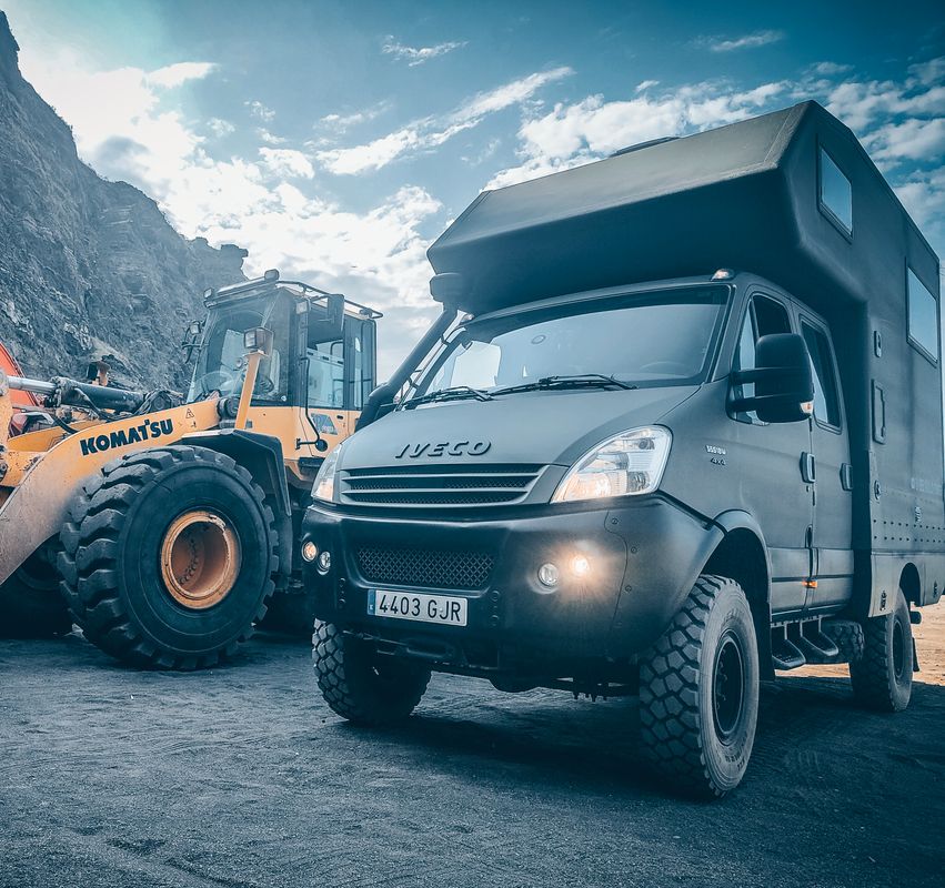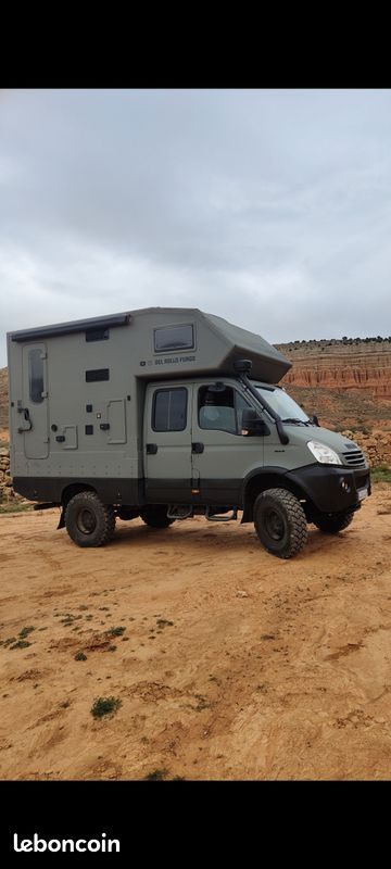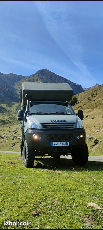 "Iveco daily 4x4 55S18W, 180CV, BLOCAGE DIFFÉRENTIEL ARRIÈRE ET CENTRAL, deux réducteurs (court et super court). Jantes plus larges que les standards, elles sont (8,5 pouces) pour gagner en stabilité (possibilité de tubeless et tube), les standards font 6,5 pouces, celles-ci ont été très difficiles à trouver. Radio Carplay, nouvellement installée avec caméra. 6 PASSAGERS.