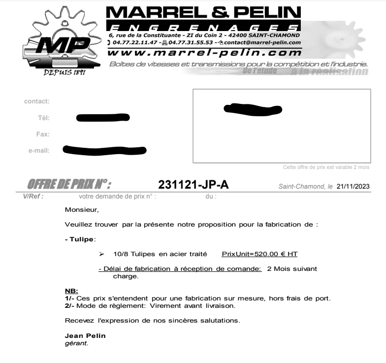 Le premier devis est tombé, celui de chez Marrel et Pelin à Lyon des spécialiste des BV / engrenages et transmissions pour la compétition.