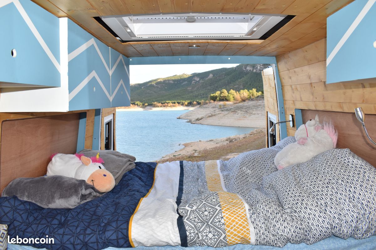 Fourgon aménagé par nous-mêmes. 3 places assises en cabine de conduite, 2 places de couchage fixes + 1 place amovible.