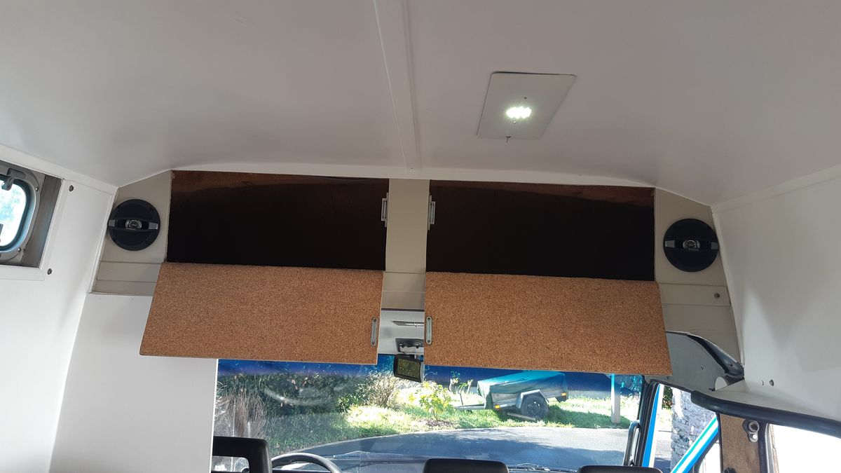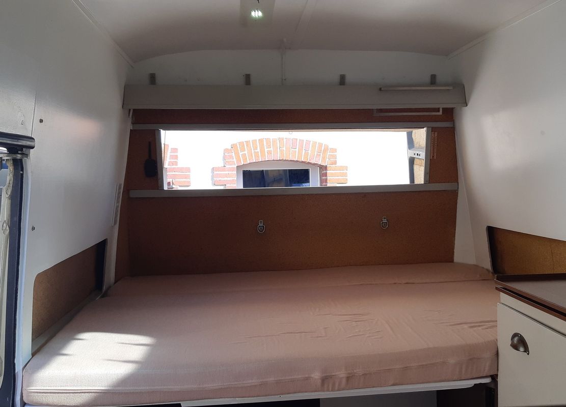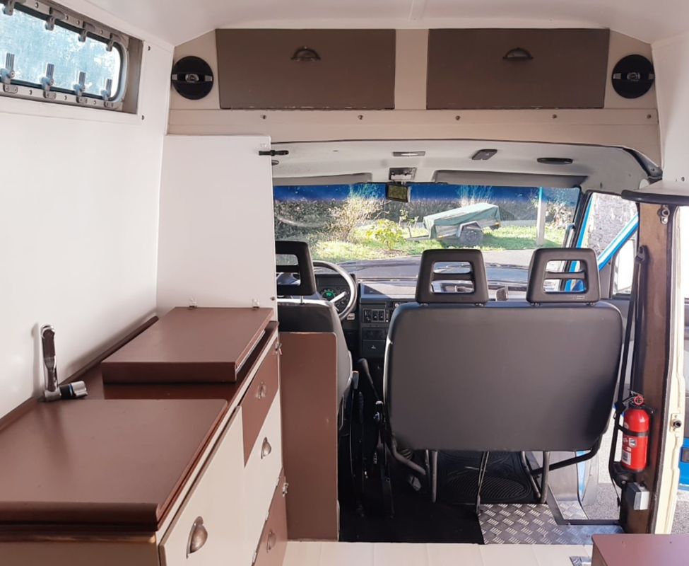 Equipements intérieur : coin cuisine (2 feux gaz), évier, réserve 80 l eau, couchage 2 pers., rangements, éclairage led, siège conducteur suspendu et banquette 2 pl d'origine + 1 siège 1 pl en supplément