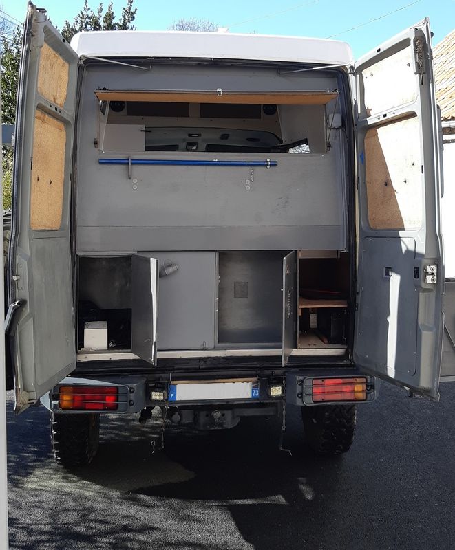 Suite à la défection d'un acheteur, je remets en vente mon IVECO DAILY 40 10 4X4 238 800 km, année 2000, 3 places, moteur 2,8 l, distribution chaîne, 45 600 km, reconditionné par Ivéco en 2020 (facture 10 300 €), batterie secondaire, blocage arrière, amortisseurs Scorpion 3R, 5 pneus Toyo neufs sur gentes Bouzinac. Ce fourgon homologué VASP atelier est aménagé sommairement avec un coin cuisine (réchaud 2 feux gaz, évier inox, réserve d'eau 80 l), un couchage 185 x 135, de nombreux rangements, des éclairage led.